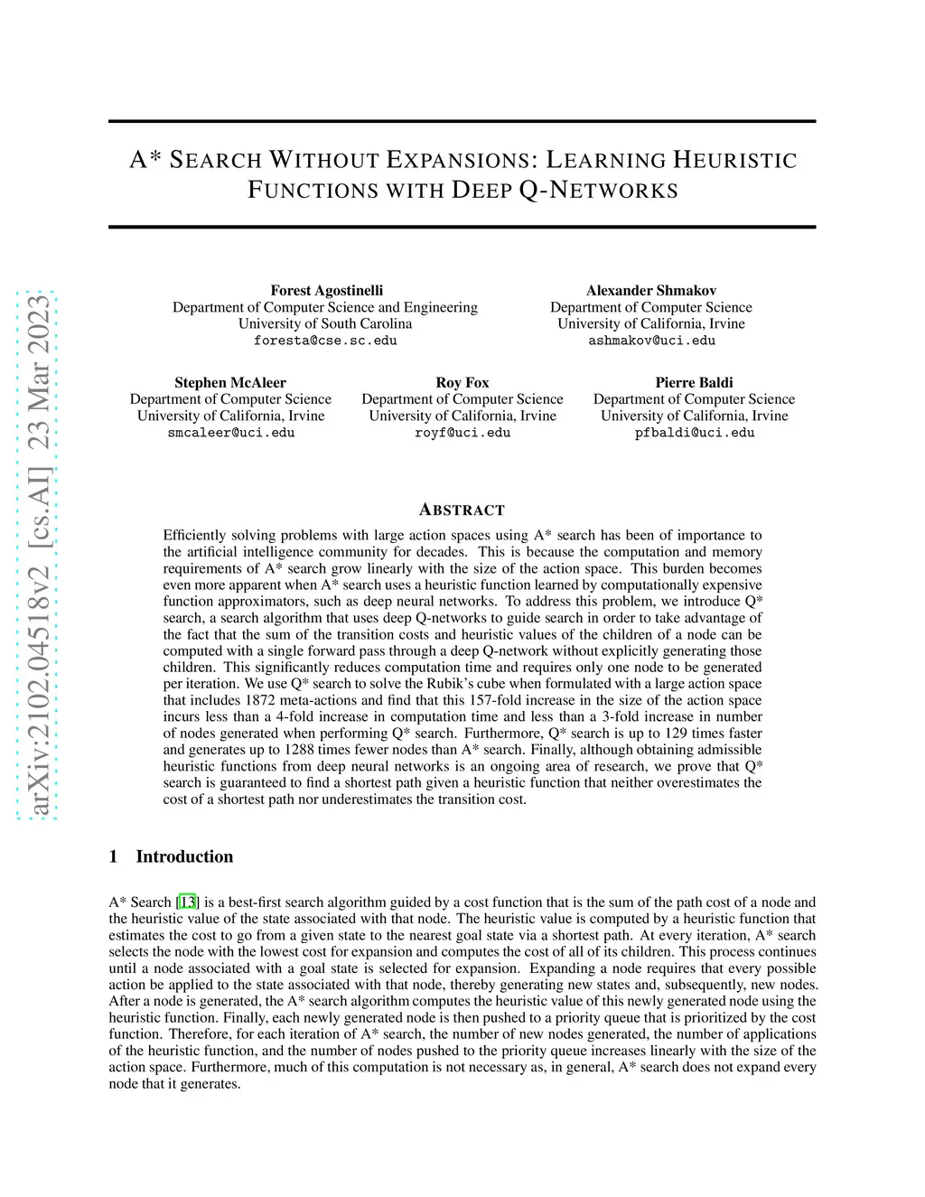 Efficiently solving problems with large action spaces using A* search remains a significant challenge. This is because, for each iteration of A* search, the number of nodes generated and the number of heuristic function applications grow linearly with the size of the action space. This burden becomes even more apparent when A* search uses a heuristic function learned by computationally expensive function approximators, such as deep neural networks. To address this issue, we introduce Q*, a search algorithm that leverages heuristics capable of receiving a state and, in a single function call, returning cost-to-go estimates for all possible transitions from that state, along with estimates of the corresponding transition costs -- without the need to apply the transitions or generate the successor states; such action-state estimation are typically known as Q-values. This significantly reduces computation time and memory usage. In addition, we prove that Q* search is guaranteed to find a shortest path given a heuristic function that does not overestimate the sum of the transition cost and cost-to-go of the state. To obtain heuristics for Q* search, we employ a deep Q-network architecture to learn a state-action heuristic function from domain interaction, without any prior knowledge. We use Q* with our learned heuristic on different domains and action spaces, showing that Q* suffers from only a small runtime overhead as the size of the action space increases. In addition, our empirical results show Q* search is up to 129 times faster and generates up to 1288 times fewer nodes than A* search.