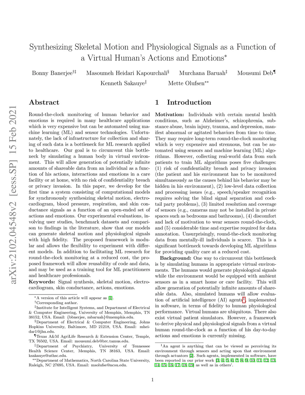 Round-the-clock monitoring of human behavior and emotions is required in many healthcare applications which is very expensive but can be automated using machine learning (ML) and sensor technologies. Unfortunately, the lack of infrastructure for collection and sharing of such data is a bottleneck for ML research applied to healthcare. Our goal is to circumvent this bottleneck by simulating a human body in virtual environment. This will allow generation of potentially infinite amounts of shareable data from an individual as a function of his actions, interactions and emotions in a care facility or at home, with no risk of confidentiality breach or privacy invasion. In this paper, we develop for the first time a system consisting of computational models for synchronously synthesizing skeletal motion, electrocardiogram, blood pressure, respiration, and skin conductance signals as a function of an open-ended set of actions and emotions. Our experimental evaluations, involving user studies, benchmark datasets and comparison to findings in the literature, show that our models can generate skeletal motion and physiological signals with high fidelity. The proposed framework is modular and allows the flexibility to experiment with different models. In addition to facilitating ML research for round-the-clock monitoring at a reduced cost, the proposed framework will allow reusability of code and data, and may be used as a training tool for ML practitioners and healthcare professionals.