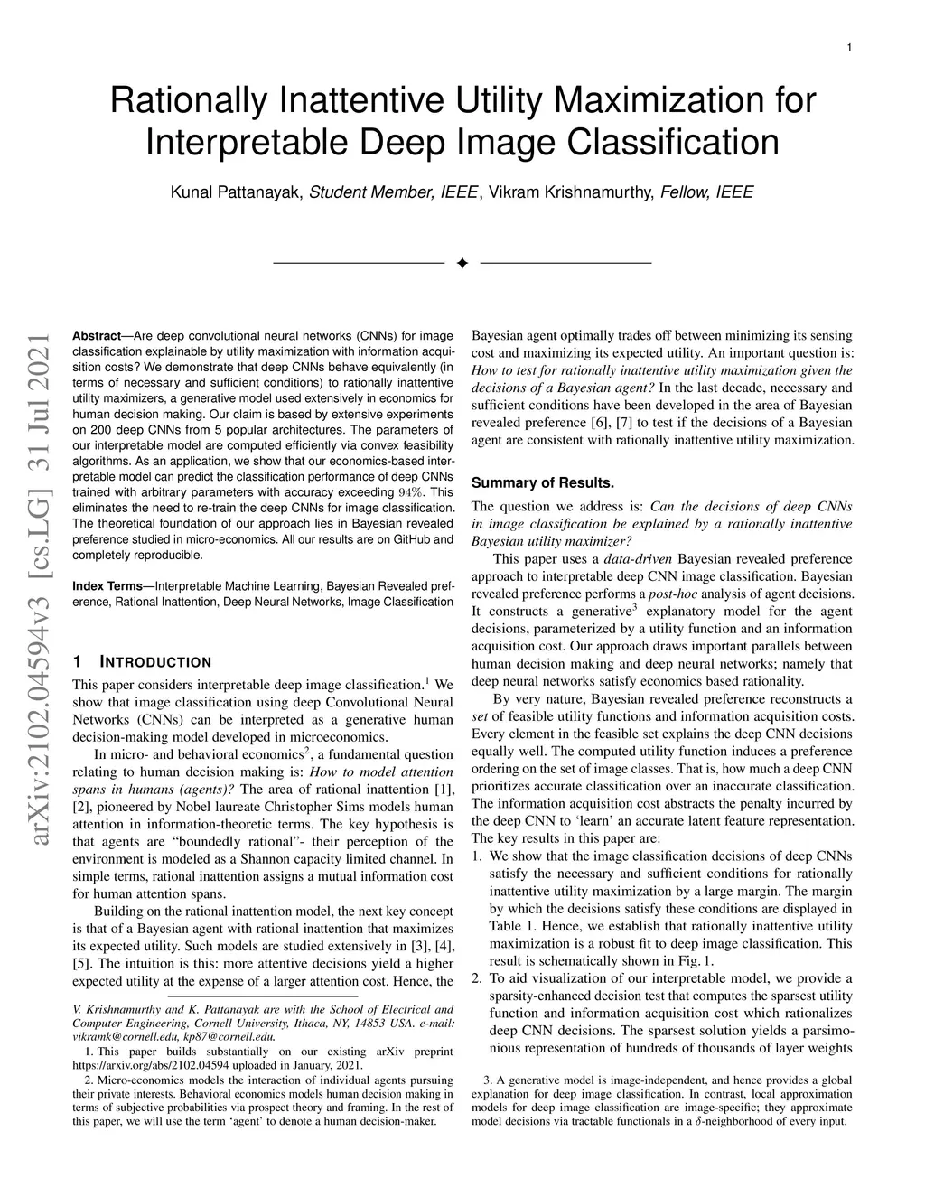 Are deep convolutional neural networks (CNNs) for image classification explainable by utility maximization with information acquisition costs? We demonstrate that deep CNNs behave equivalently (in terms of necessary and sufficient conditions) to rationally inattentive utility maximizers, a generative model used extensively in economics for human decision making. Our claim is based by extensive experiments on 200 deep CNNs from 5 popular architectures. The parameters of our interpretable model are computed efficiently via convex feasibility algorithms. As an application, we show that our economics-based interpretable model can predict the classification performance of deep CNNs trained with arbitrary parameters with accuracy exceeding 94% . This eliminates the need to re-train the deep CNNs for image classification. The theoretical foundation of our approach lies in Bayesian revealed preference studied in micro-economics. All our results are on GitHub and completely reproducible.