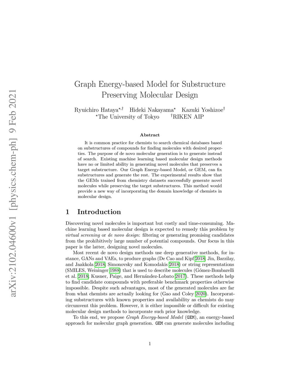 It is common practice for chemists to search chemical databases based on substructures of compounds for finding molecules with desired properties. The purpose of de novo molecular generation is to generate instead of search. Existing machine learning based molecular design methods have no or limited ability in generating novel molecules that preserves a target substructure. Our Graph Energy-based Model, or GEM, can fix substructures and generate the rest. The experimental results show that the GEMs trained from chemistry datasets successfully generate novel molecules while preserving the target substructures. This method would provide a new way of incorporating the domain knowledge of chemists in molecular design.