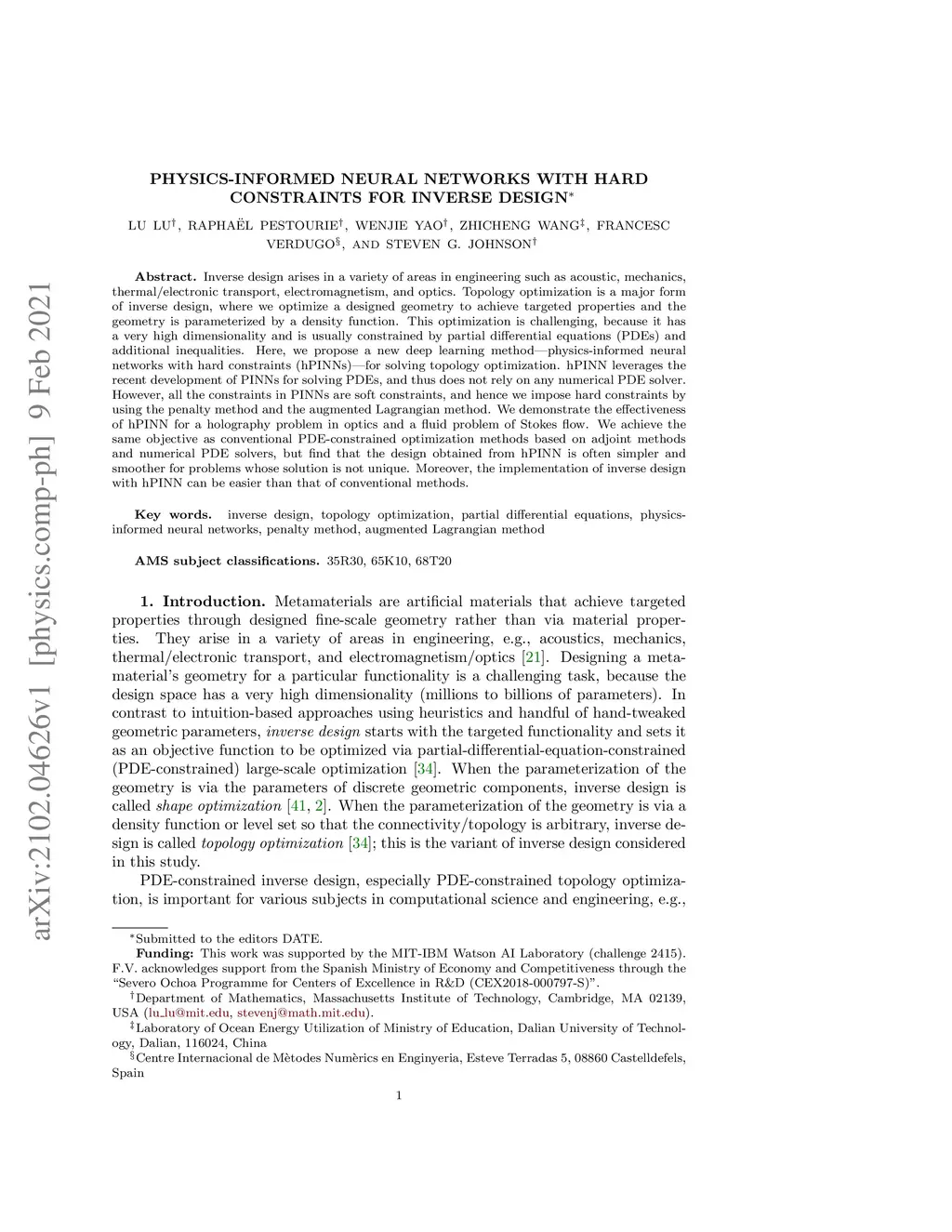 Inverse design arises in a variety of areas in engineering such as acoustic, mechanics, thermal/electronic transport, electromagnetism, and optics. Topology optimization is a major form of inverse design, where we optimize a designed geometry to achieve targeted properties and the geometry is parameterized by a density function. This optimization is challenging, because it has a very high dimensionality and is usually constrained by partial differential equations (PDEs) and additional inequalities. Here, we propose a new deep learning method -- physics-informed neural networks with hard constraints (hPINNs) -- for solving topology optimization. hPINN leverages the recent development of PINNs for solving PDEs, and thus does not rely on any numerical PDE solver. However, all the constraints in PINNs are soft constraints, and hence we impose hard constraints by using the penalty method and the augmented Lagrangian method. We demonstrate the effectiveness of hPINN for a holography problem in optics and a fluid problem of Stokes flow. We achieve the same objective as conventional PDE-constrained optimization methods based on adjoint methods and numerical PDE solvers, but find that the design obtained from hPINN is often simpler and smoother for problems whose solution is not unique. Moreover, the implementation of inverse design with hPINN can be easier than that of conventional methods.