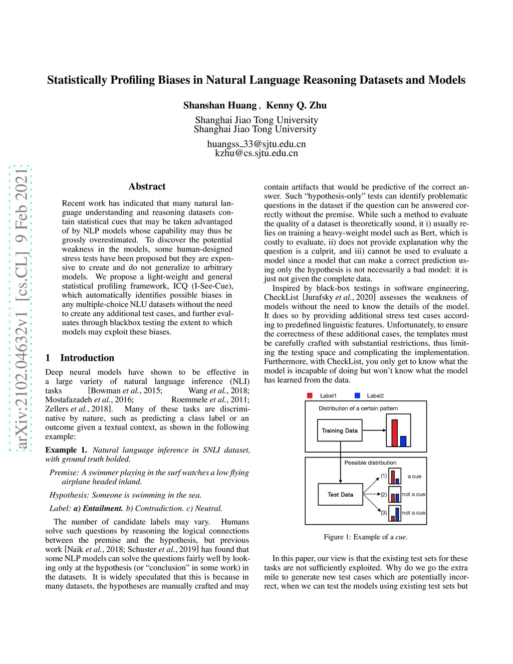 Recent work has indicated that many natural language understanding and reasoning datasets contain statistical cues that may be taken advantaged of by NLP models whose capability may thus be grossly overestimated. To discover the potential weakness in the models, some human-designed stress tests have been proposed but they are expensive to create and do not generalize to arbitrary models. We propose a light-weight and general statistical profiling framework, ICQ (I-See-Cue), which automatically identifies possible biases in any multiple-choice NLU datasets without the need to create any additional test cases, and further evaluates through blackbox testing the extent to which models may exploit these biases.