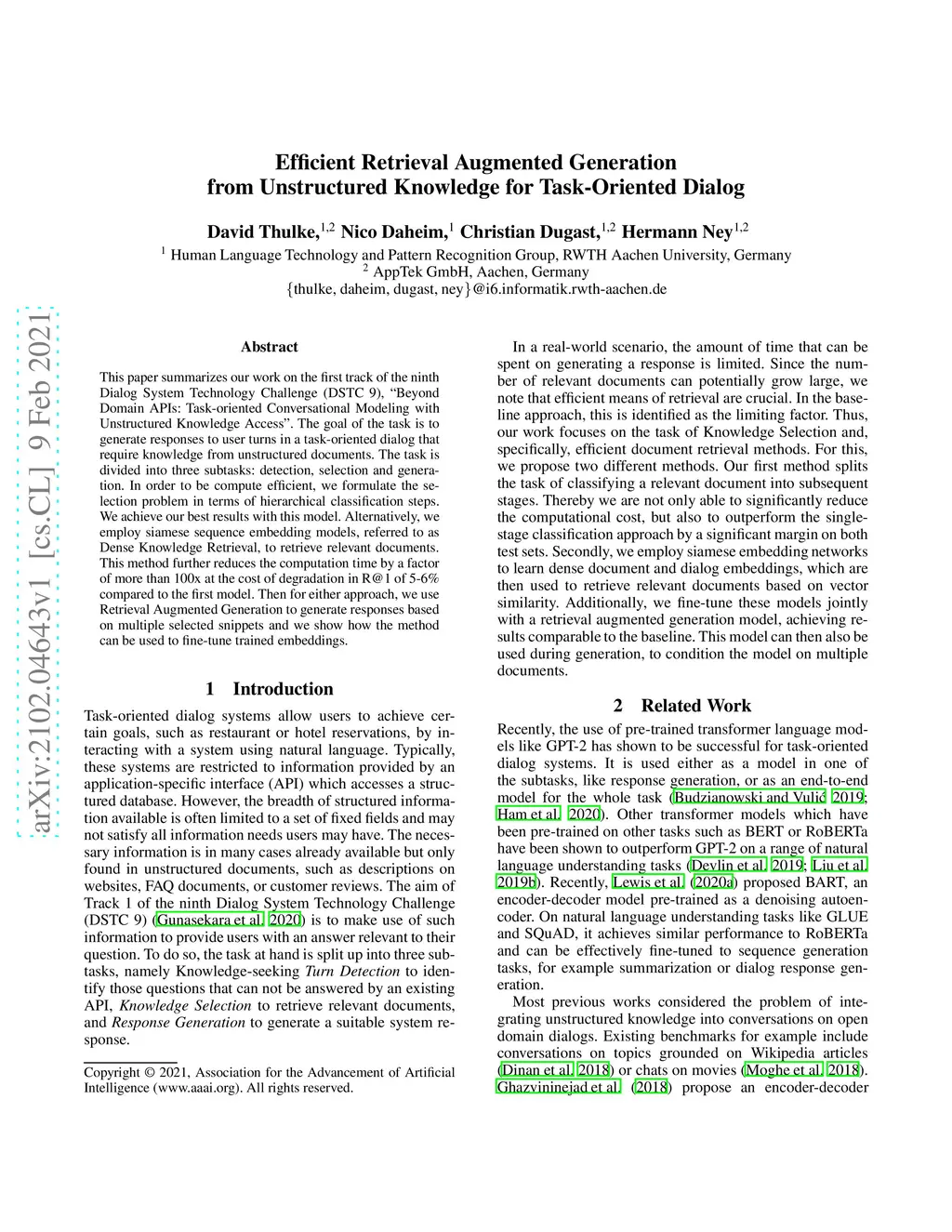 This paper summarizes our work on the first track of the ninth Dialog System Technology Challenge (DSTC 9), "Beyond Domain APIs: Task-oriented Conversational Modeling with Unstructured Knowledge Access". The goal of the task is to generate responses to user turns in a task-oriented dialog that require knowledge from unstructured documents. The task is divided into three subtasks: detection, selection and generation. In order to be compute efficient, we formulate the selection problem in terms of hierarchical classification steps. We achieve our best results with this model. Alternatively, we employ siamese sequence embedding models, referred to as Dense Knowledge Retrieval, to retrieve relevant documents. This method further reduces the computation time by a factor of more than 100x at the cost of degradation in R@1 of 5-6% compared to the first model. Then for either approach, we use Retrieval Augmented Generation to generate responses based on multiple selected snippets and we show how the method can be used to fine-tune trained embeddings.