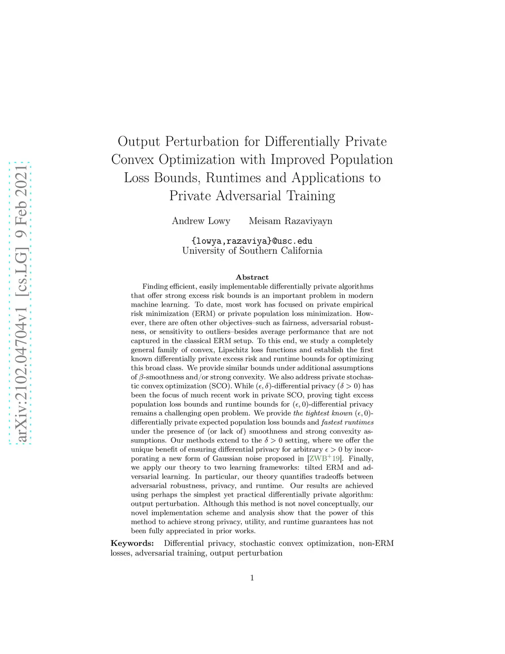 Finding efficient, easily implementable differentially private (DP) algorithms that offer strong excess risk bounds is an important problem in modern machine learning. To date, most work has focused on private empirical risk minimization (ERM) or private population loss minimization. However, there are often other objectives--such as fairness, adversarial robustness, or sensitivity to outliers--besides average performance that are not captured in the classical ERM setup. To this end, we study a completely general family of convex, Lipschitz loss functions and establish the first known DP excess risk and runtime bounds for optimizing this broad class. We provide similar bounds under additional assumptions of smoothness and/or strong convexity. We also address private stochastic convex optimization (SCO). While -DP () has been the focus of much recent work in private SCO, proving tight population loss bounds and runtime bounds for -DP remains a challenging open problem. We provide the tightest known -DP population loss bounds and fastest runtimes under the presence of (or lack of) smoothness and strong convexity. Our methods extend to the setting, where we offer the unique benefit of ensuring differential privacy for arbitrary by incorporating a new form of Gaussian noise. Finally, we apply our theory to two learning frameworks: tilted ERM and adversarial learning. In particular, our theory quantifies tradeoffs between adversarial robustness, privacy, and runtime. Our results are achieved using perhaps the simplest DP algorithm: output perturbation. Although this method is not novel conceptually, our novel implementation scheme and analysis show that the power of this method to achieve strong privacy, utility, and runtime guarantees has not been fully appreciated in prior works.
