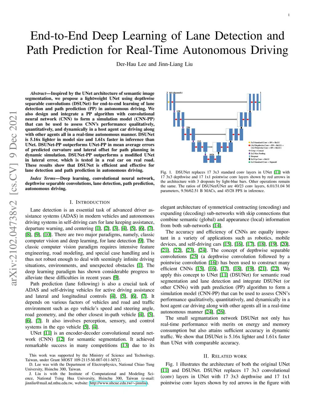 Inspired by the UNet architecture of semantic image segmentation, we propose a lightweight UNet using depthwise separable convolutions (DSUNet) for end-to-end learning of lane detection and path prediction (PP) in autonomous driving. We also design and integrate a PP algorithm with convolutional neural network (CNN) to form a simulation model (CNN-PP) that can be used to assess CNN's performance qualitatively, quantitatively, and dynamically in a host agent car driving along with other agents all in a real-time autonomous manner. DSUNet is 5.16x lighter in model size and 1.61x faster in inference than UNet. DSUNet-PP outperforms UNet-PP in mean average errors of predicted curvature and lateral offset for path planning in dynamic simulation. DSUNet-PP outperforms a modified UNet in lateral error, which is tested in a real car on real road. These results show that DSUNet is efficient and effective for lane detection and path prediction in autonomous driving.