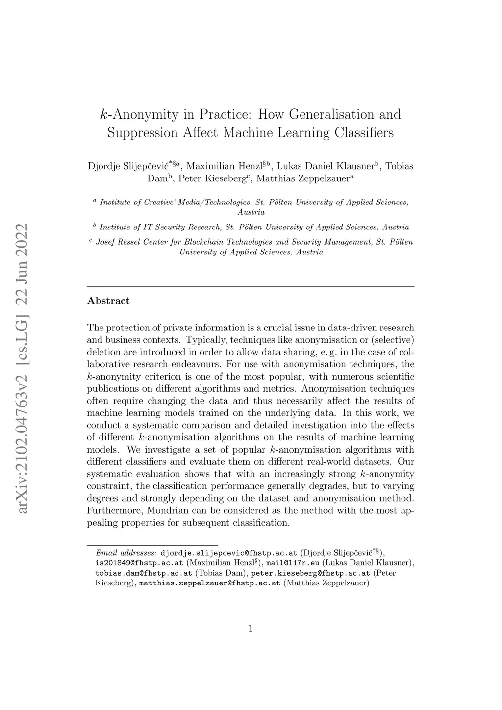 The protection of private information is a crucial issue in data-driven research and business contexts. Typically, techniques like anonymisation or (selective) deletion are introduced in order to allow data sharing, e. g. in the case of collaborative research endeavours. For use with anonymisation techniques, the -anonymity criterion is one of the most popular, with numerous scientific publications on different algorithms and metrics. Anonymisation techniques often require changing the data and thus necessarily affect the results of machine learning models trained on the underlying data. In this work, we conduct a systematic comparison and detailed investigation into the effects of different -anonymisation algorithms on the results of machine learning models. We investigate a set of popular -anonymisation algorithms with different classifiers and evaluate them on different real-world datasets. Our systematic evaluation shows that with an increasingly strong -anonymity constraint, the classification performance generally degrades, but to varying degrees and strongly depending on the dataset and anonymisation method. Furthermore, Mondrian can be considered as the method with the most appealing properties for subsequent classification.