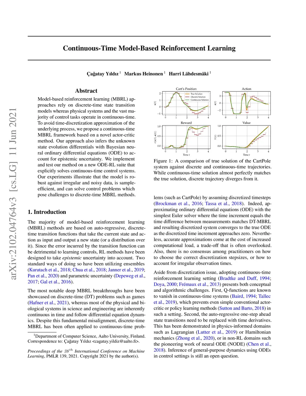 Model-based reinforcement learning (MBRL) approaches rely on discrete-time state transition models whereas physical systems and the vast majority of control tasks operate in continuous-time. To avoid time-discretization approximation of the underlying process, we propose a continuous-time MBRL framework based on a novel actor-critic method. Our approach also infers the unknown state evolution differentials with Bayesian neural ordinary differential equations (ODE) to account for epistemic uncertainty. We implement and test our method on a new ODE-RL suite that explicitly solves continuous-time control systems. Our experiments illustrate that the model is robust against irregular and noisy data, is sample-efficient, and can solve control problems which pose challenges to discrete-time MBRL methods.