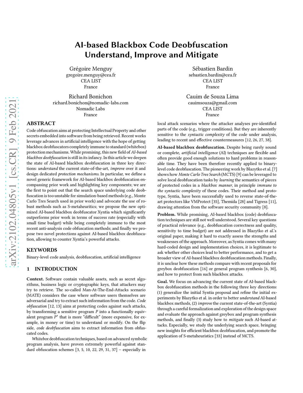 Code obfuscation aims at protecting Intellectual Property and other secrets embedded into software from being retrieved. Recent works leverage advances in artificial intelligence with the hope of getting blackbox deobfuscators completely immune to standard (whitebox) protection mechanisms. While promising, this new field of AI-based blackbox deobfuscation is still in its infancy. In this article we deepen the state of AI-based blackbox deobfuscation in three key directions: understand the current state-of-the-art, improve over it and design dedicated protection mechanisms. In particular, we define a novel generic framework for AI-based blackbox deobfuscation encompassing prior work and highlighting key components; we are the first to point out that the search space underlying code deobfuscation is too unstable for simulation-based methods (e.g., Monte Carlo Tres Search used in prior work) and advocate the use of robust methods such as S-metaheuritics; we propose the new optimized AI-based blackbox deobfuscator Xyntia which significantly outperforms prior work in terms of success rate (especially with small time budget) while being completely immune to the most recent anti-analysis code obfuscation methods; and finally we propose two novel protections against AI-based blackbox deobfuscation, allowing to counter Xyntia's powerful attacks.