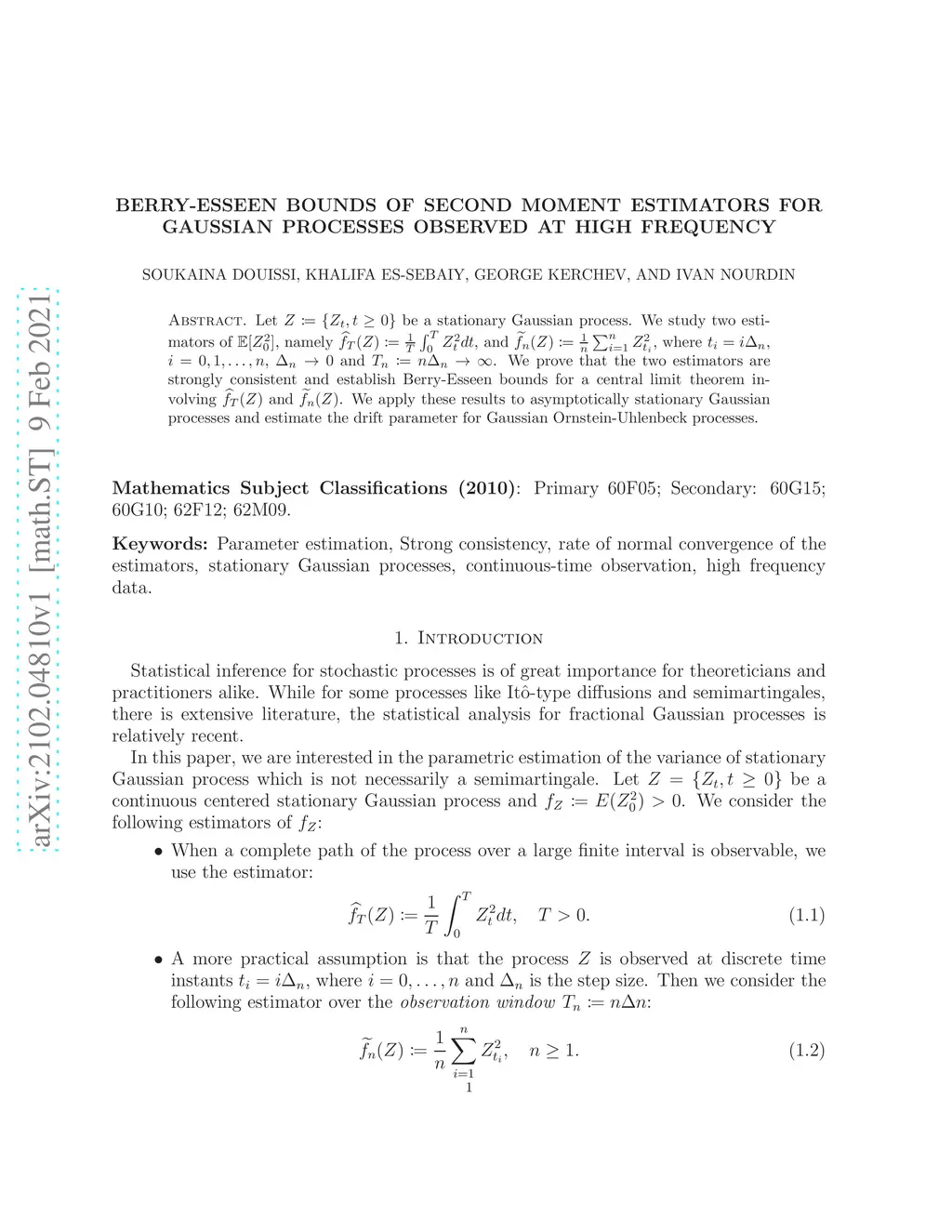 Let be a stationary Gaussian process. We study two estimators of , namely , and , where $ t_{i} = i \Delta_{n}$, $ i=0,1,\ldots, n $, and $ T_{n} := n \Delta_{n}\rightarrow \infty$. We prove that the two estimators are strongly consistent and establish Berry-Esseen bounds for a central limit theorem involving and . We apply these results to asymptotically stationary Gaussian processes and estimate the drift parameter for Gaussian Ornstein-Uhlenbeck processes.