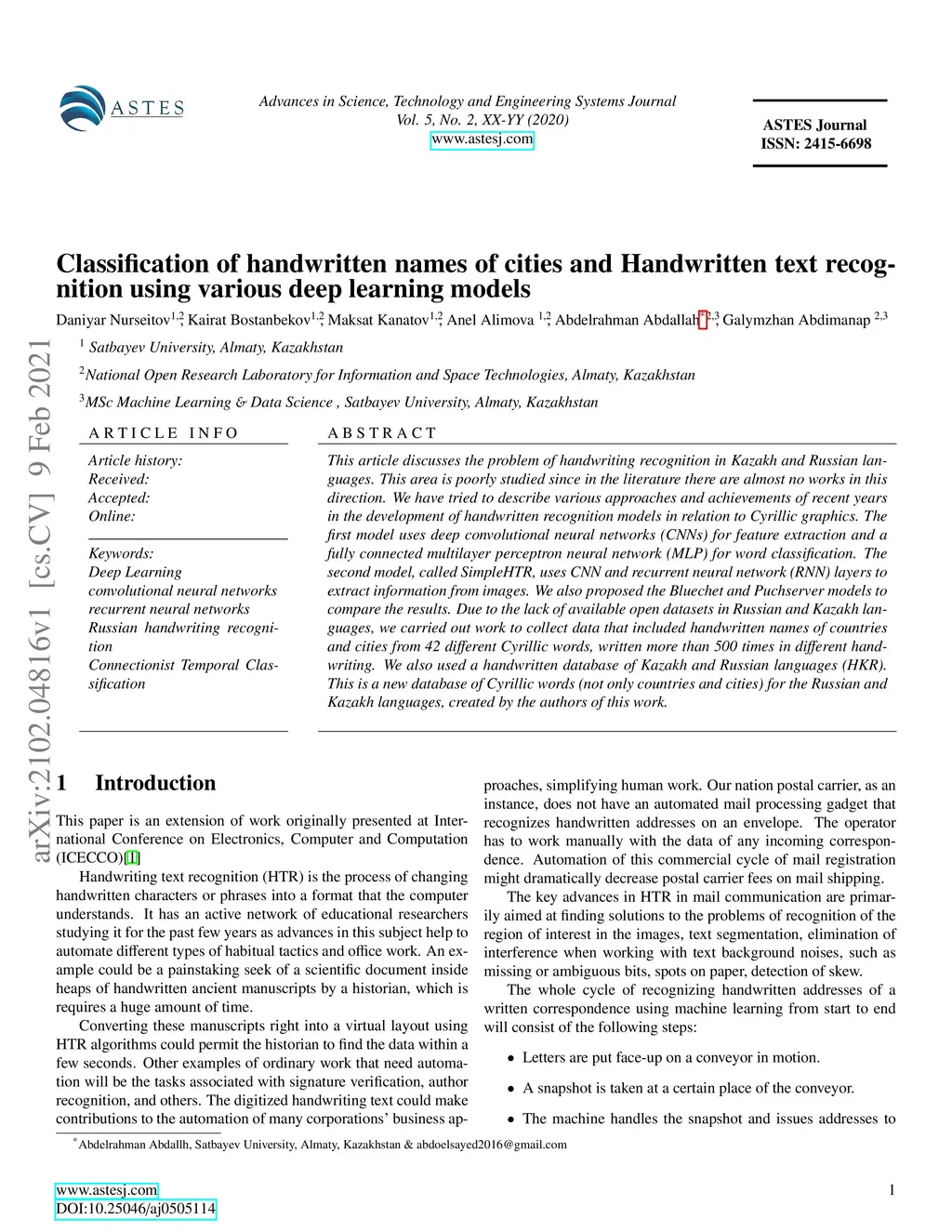 This article discusses the problem of handwriting recognition in Kazakh and Russian languages. This area is poorly studied since in the literature there are almost no works in this direction. We have tried to describe various approaches and achievements of recent years in the development of handwritten recognition models in relation to Cyrillic graphics. The first model uses deep convolutional neural networks (CNNs) for feature extraction and a fully connected multilayer perceptron neural network (MLP) for word classification. The second model, called SimpleHTR, uses CNN and recurrent neural network (RNN) layers to extract information from images. We also proposed the Bluechet and Puchserver models to compare the results. Due to the lack of available open datasets in Russian and Kazakh languages, we carried out work to collect data that included handwritten names of countries and cities from 42 different Cyrillic words, written more than 500 times in different handwriting. We also used a handwritten database of Kazakh and Russian languages (HKR). This is a new database of Cyrillic words (not only countries and cities) for the Russian and Kazakh languages, created by the authors of this work.