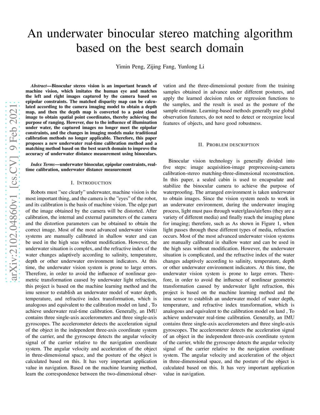 Binocular stereo vision is an important branch of machine vision, which imitates the human eye and matches the left and right images captured by the camera based on epipolar constraints. The matched disparity map can be calculated according to the camera imaging model to obtain a depth map, and then the depth map is converted to a point cloud image to obtain spatial point coordinates, thereby achieving the purpose of ranging. However, due to the influence of illumination under water, the captured images no longer meet the epipolar constraints, and the changes in imaging models make traditional calibration methods no longer applicable. Therefore, this paper proposes a new underwater real-time calibration method and a matching method based on the best search domain to improve the accuracy of underwater distance measurement using binoculars.