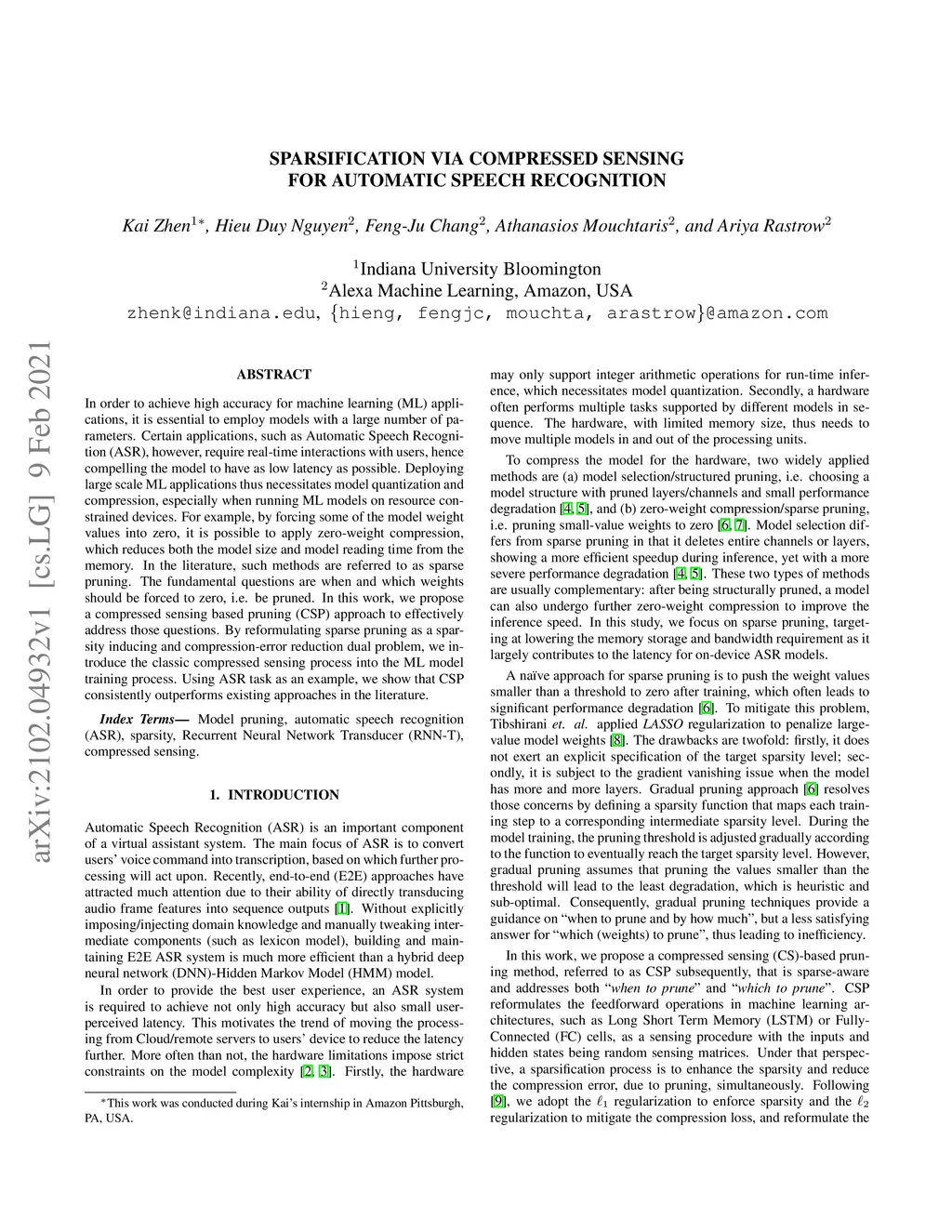Sparsification via Compressed Sensing for Automatic Speech Recognition