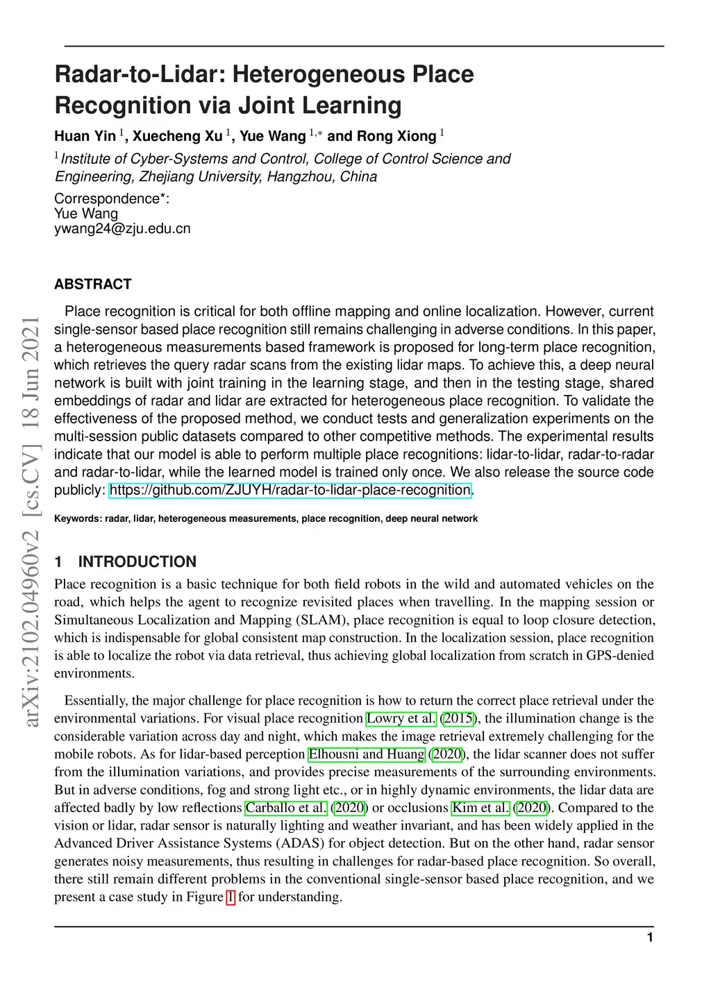 Radar-to-Lidar: Heterogeneous Place Recognition via Joint Learning