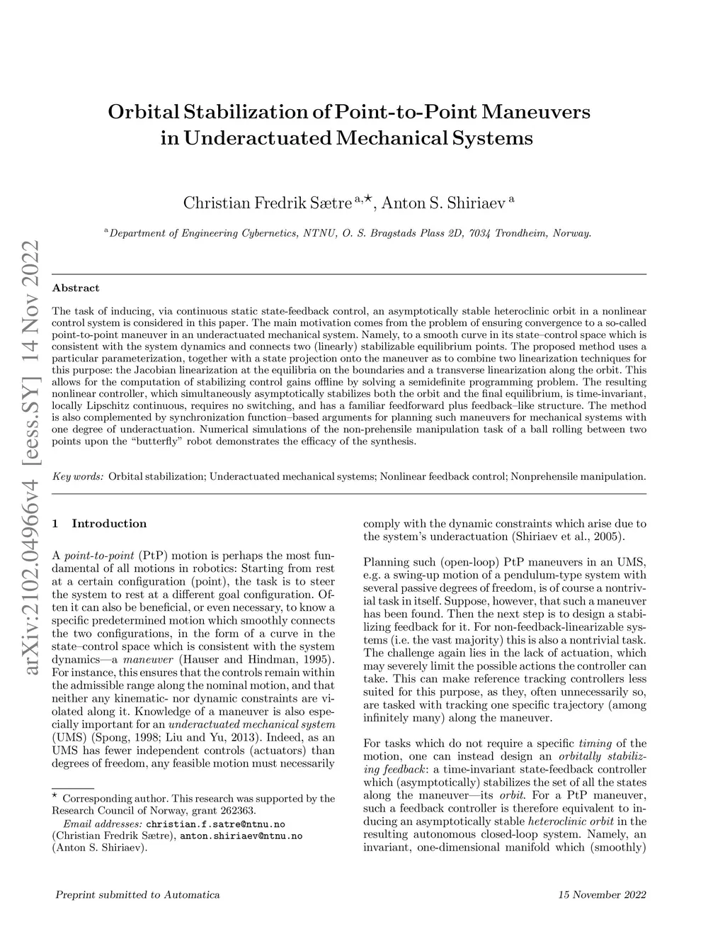 The task of inducing, via continuous static state-feedback control, an asymptotically stable heteroclinic orbit in a nonlinear control system is considered in this paper. The main motivation comes from the problem of ensuring convergence to a so-called point-to-point maneuver in an underactuated mechanical system. Namely, to a smooth curve in its state--control space, which is consistent with the system dynamics and connects two (linearly) stabilizable equilibrium points. The proposed method uses a particular parameterization, together with a state projection onto the maneuver as to combine two linearization techniques for this purpose: the Jacobian linearization at the equilibria on the boundaries and a transverse linearization along the orbit. This allows for the computation of stabilizing control gains offline by solving a semidefinite programming problem. The resulting nonlinear controller, which simultaneously asymptotically stabilizes both the orbit and the final equilibrium, is time-invariant, locally Lipschitz continuous, requires no switching, and has a familiar feedforward plus feedback--like structure. The method is also complemented by synchronization function--based arguments for planning such maneuvers for mechanical systems with one degree of underactuation. Numerical simulations of the non-prehensile manipulation task of a ball rolling between two points upon the "butterfly" robot demonstrates the efficacy of the synthesis.