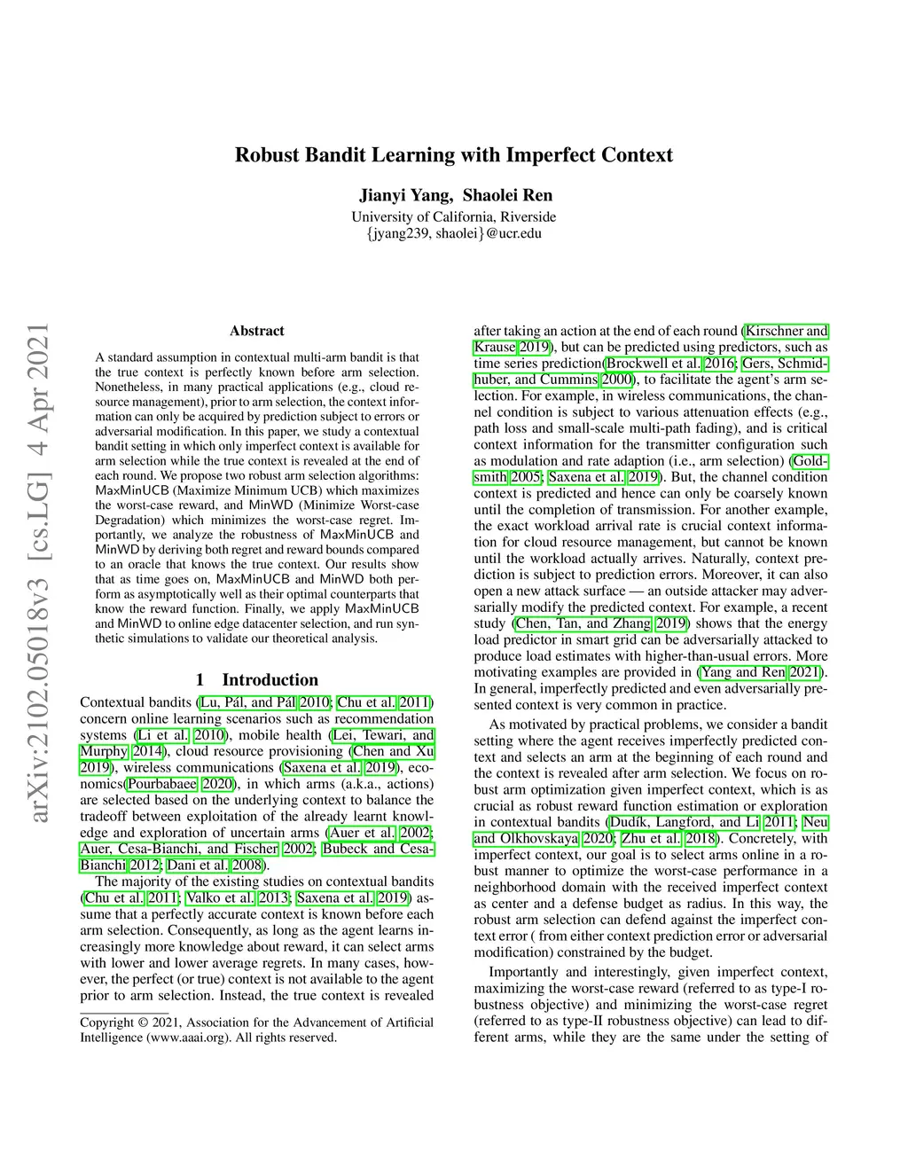 A standard assumption in contextual multi-arm bandit is that the true context is perfectly known before arm selection. Nonetheless, in many practical applications (e.g., cloud resource management), prior to arm selection, the context information can only be acquired by prediction subject to errors or adversarial modification. In this paper, we study a contextual bandit setting in which only imperfect context is available for arm selection while the true context is revealed at the end of each round. We propose two robust arm selection algorithms: MaxMinUCB (Maximize Minimum UCB) which maximizes the worst-case reward, and MinWD (Minimize Worst-case Degradation) which minimizes the worst-case regret. Importantly, we analyze the robustness of MaxMinUCB and MinWD by deriving both regret and reward bounds compared to an oracle that knows the true context. Our results show that as time goes on, MaxMinUCB and MinWD both perform as asymptotically well as their optimal counterparts that know the reward function. Finally, we apply MaxMinUCB and MinWD to online edge datacenter selection, and run synthetic simulations to validate our theoretical analysis.