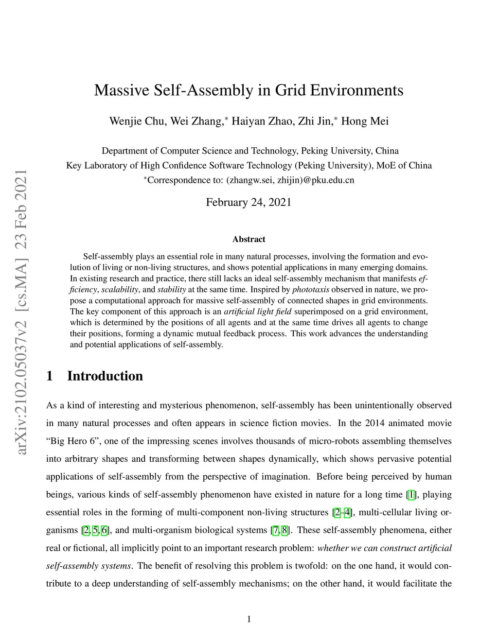 Self-assembly plays an essential role in many natural processes, involving the formation and evolution of living or non-living structures, and shows potential applications in many emerging domains. In existing research and practice, there still lacks an ideal self-assembly mechanism that manifests efficiency, scalability, and stability at the same time. Inspired by phototaxis observed in nature, we propose a computational approach for massive self-assembly of connected shapes in grid environments. The key component of this approach is an artificial light field superimposed on a grid environment, which is determined by the positions of all agents and at the same time drives all agents to change their positions, forming a dynamic mutual feedback process. This work advances the understanding and potential applications of self-assembly.