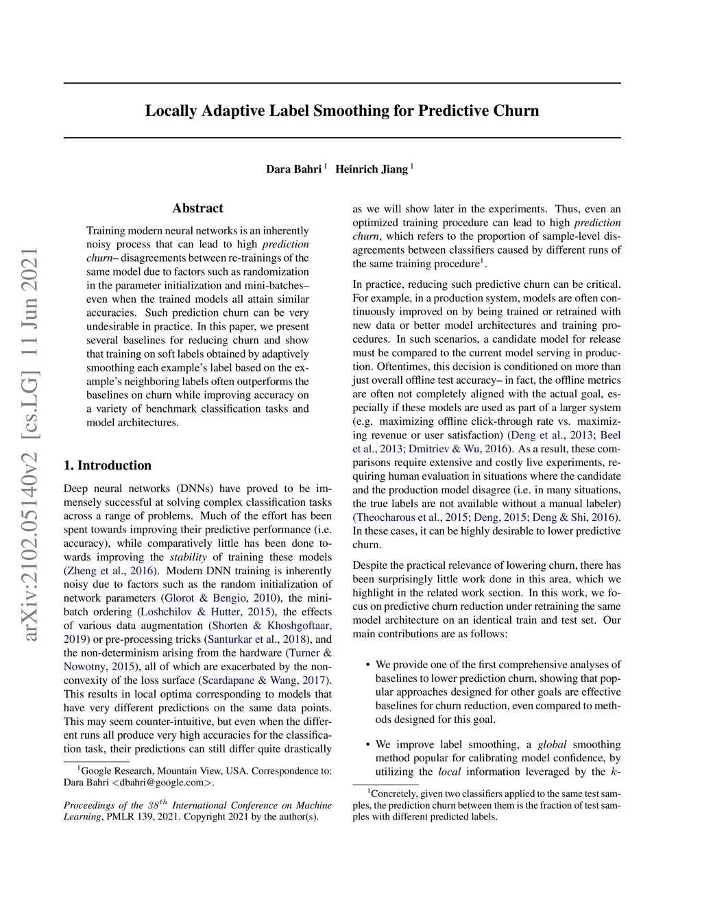 Training modern neural networks is an inherently noisy process that can lead to high \emph{prediction churn} -- disagreements between re-trainings of the same model due to factors such as randomization in the parameter initialization and mini-batches -- even when the trained models all attain similar accuracies. Such prediction churn can be very undesirable in practice. In this paper, we present several baselines for reducing churn and show that training on soft labels obtained by adaptively smoothing each example's label based on the example's neighboring labels often outperforms the baselines on churn while improving accuracy on a variety of benchmark classification tasks and model architectures.