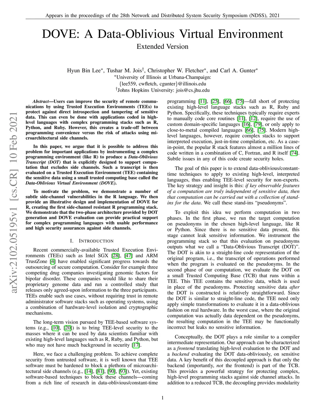 Users can improve the security of remote communications by using Trusted Execution Environments (TEEs) to protect against direct introspection and tampering of sensitive data. This can even be done with applications coded in high-level languages with complex programming stacks such as R, Python, and Ruby. However, this creates a trade-off between programming convenience versus the risk of attacks using microarchitectural side channels. In this paper, we argue that it is possible to address this problem for important applications by instrumenting a complex programming environment (like R) to produce a Data-Oblivious Transcript (DOT) that is explicitly designed to support computation that excludes side channels. Such a transcript is then evaluated on a Trusted Execution Environment (TEE) containing the sensitive data using a small trusted computing base called the Data-Oblivious Virtual Environment (DOVE). To motivate the problem, we demonstrate a number of subtle side-channel vulnerabilities in the R language. We then provide an illustrative design and implementation of DOVE for R, creating the first side-channel resistant R programming stack. We demonstrate that the two-phase architecture provided by DOT generation and DOVE evaluation can provide practical support for complex programming languages with usable performance and high security assurances against side channels.
