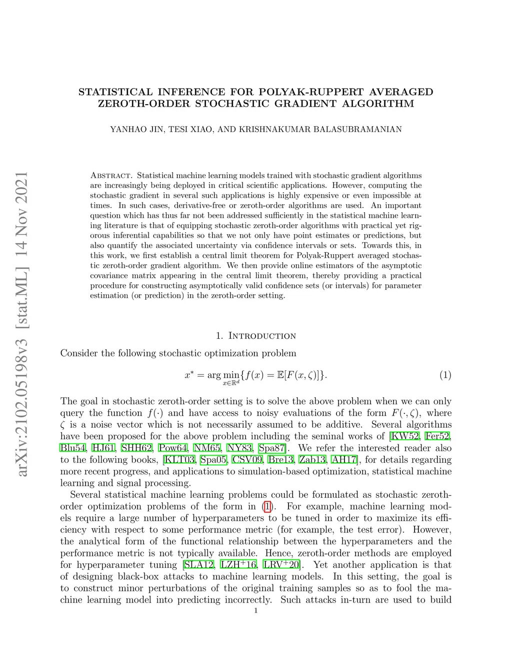 Statistical machine learning models trained with stochastic gradient algorithms are increasingly being deployed in critical scientific applications. However, computing the stochastic gradient in several such applications is highly expensive or even impossible at times. In such cases, derivative-free or zeroth-order algorithms are used. An important question which has thus far not been addressed sufficiently in the statistical machine learning literature is that of equipping stochastic zeroth-order algorithms with practical yet rigorous inferential capabilities so that we not only have point estimates or predictions but also quantify the associated uncertainty via confidence intervals or sets. Towards this, in this work, we first establish a central limit theorem for Polyak-Ruppert averaged stochastic zeroth-order gradient algorithm. We then provide online estimators of the asymptotic covariance matrix appearing in the central limit theorem, thereby providing a practical procedure for constructing asymptotically valid confidence sets (or intervals) for parameter estimation (or prediction) in the zeroth-order setting.