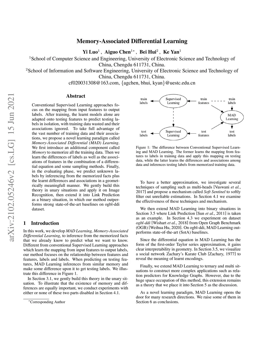 Conventional Supervised Learning approaches focus on the mapping from input features to output labels. After training, the learnt models alone are adapted onto testing features to predict testing labels in isolation, with training data wasted and their associations ignored. To take full advantage of the vast number of training data and their associations, we propose a novel learning paradigm called Memory-Associated Differential (MAD) Learning. We first introduce an additional component called Memory to memorize all the training data. Then we learn the differences of labels as well as the associations of features in the combination of a differential equation and some sampling methods. Finally, in the evaluating phase, we predict unknown labels by inferencing from the memorized facts plus the learnt differences and associations in a geometrically meaningful manner. We gently build this theory in unary situations and apply it on Image Recognition, then extend it into Link Prediction as a binary situation, in which our method outperforms strong state-of-the-art baselines on ogbl-ddi dataset.