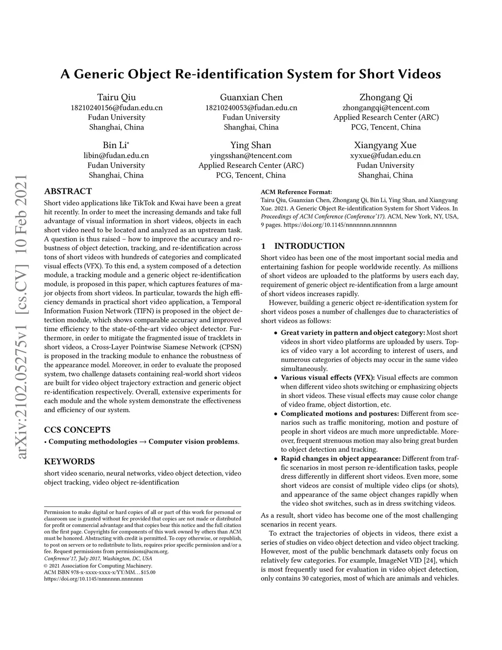 Short video applications like TikTok and Kwai have been a great hit recently. In order to meet the increasing demands and take full advantage of visual information in short videos, objects in each short video need to be located and analyzed as an upstream task. A question is thus raised -- how to improve the accuracy and robustness of object detection, tracking, and re-identification across tons of short videos with hundreds of categories and complicated visual effects (VFX). To this end, a system composed of a detection module, a tracking module and a generic object re-identification module, is proposed in this paper, which captures features of major objects from short videos. In particular, towards the high efficiency demands in practical short video application, a Temporal Information Fusion Network (TIFN) is proposed in the object detection module, which shows comparable accuracy and improved time efficiency to the state-of-the-art video object detector. Furthermore, in order to mitigate the fragmented issue of tracklets in short videos, a Cross-Layer Pointwise Siamese Network (CPSN) is proposed in the tracking module to enhance the robustness of the appearance model. Moreover, in order to evaluate the proposed system, two challenge datasets containing real-world short videos are built for video object trajectory extraction and generic object re-identification respectively. Overall, extensive experiments for each module and the whole system demonstrate the effectiveness and efficiency of our system.