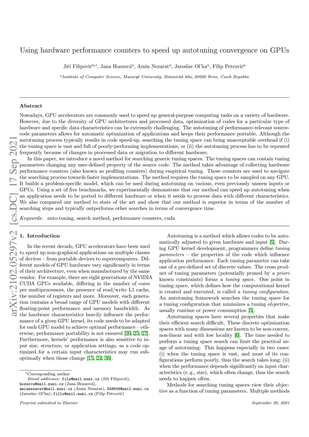 Nowadays, GPU accelerators are commonly used to speed up general-purpose computing tasks on a variety of hardware. However, due to the diversity of GPU architectures and processed data, optimization of codes for a particular type of hardware and specific data characteristics can be extremely challenging. The autotuning of performance-relevant source-code parameters allows for automatic optimization of applications and keeps their performance portable. Although the autotuning process typically results in code speed-up, searching the tuning space can bring unacceptable overhead if (i) the tuning space is vast and full of poorly-performing implementations, or (ii) the autotuning process has to be repeated frequently because of changes in processed data or migration to different hardware. In this paper, we introduce a novel method for searching tuning spaces. The method takes advantage of collecting hardware performance counters (also known as profiling counters) during empirical tuning. Those counters are used to navigate the searching process towards faster implementations. The method requires the tuning space to be sampled on any GPU. It builds a problem-specific model, which can be used during autotuning on various, even previously unseen inputs or GPUs. Using a set of five benchmarks, we experimentally demonstrate that our method can speed up autotuning when an application needs to be ported to different hardware or when it needs to process data with different characteristics. We also compared our method to state of the art and show that our method is superior in terms of the number of searching steps and typically outperforms other searches in terms of convergence time.