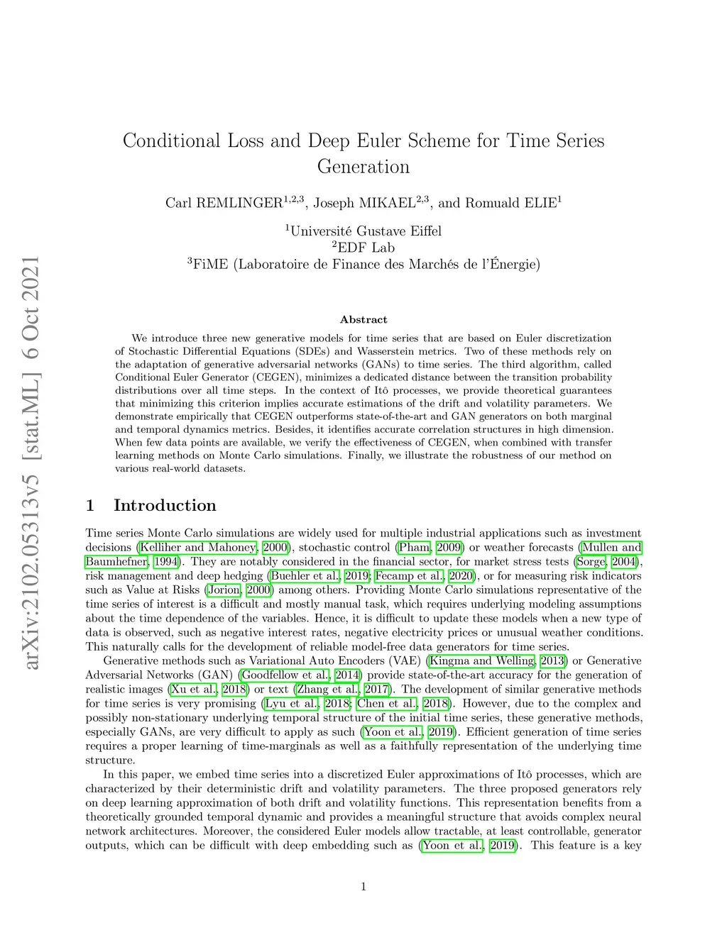 We introduce three new generative models for time series that are based on Euler discretization of Stochastic Differential Equations (SDEs) and Wasserstein metrics. Two of these methods rely on the adaptation of generative adversarial networks (GANs) to time series. The third algorithm, called Conditional Euler Generator (CEGEN), minimizes a dedicated distance between the transition probability distributions over all time steps. In the context of Ito processes, we provide theoretical guarantees that minimizing this criterion implies accurate estimations of the drift and volatility parameters. We demonstrate empirically that CEGEN outperforms state-of-the-art and GAN generators on both marginal and temporal dynamics metrics. Besides, it identifies accurate correlation structures in high dimension. When few data points are available, we verify the effectiveness of CEGEN, when combined with transfer learning methods on Monte Carlo simulations. Finally, we illustrate the robustness of our method on various real-world datasets.