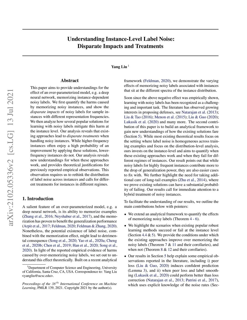 This paper aims to provide understandings for the effect of an over-parameterized model, e.g. a deep neural network, memorizing instance-dependent noisy labels. We first quantify the harms caused by memorizing noisy instances, and show the disparate impacts of noisy labels for sample instances with different representation frequencies. We then analyze how several popular solutions for learning with noisy labels mitigate this harm at the instance level. Our analysis reveals that existing approaches lead to disparate treatments when handling noisy instances. While higher-frequency instances often enjoy a high probability of an improvement by applying these solutions, lower-frequency instances do not. Our analysis reveals new understandings for when these approaches work, and provides theoretical justifications for previously reported empirical observations. This observation requires us to rethink the distribution of label noise across instances and calls for different treatments for instances in different regimes.