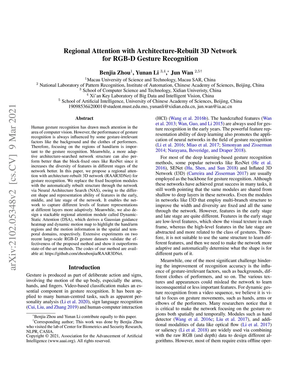 Human gesture recognition has drawn much attention in the area of computer vision. However, the performance of gesture recognition is always influenced by some gesture-irrelevant factors like the background and the clothes of performers. Therefore, focusing on the regions of hand/arm is important to the gesture recognition. Meanwhile, a more adaptive architecture-searched network structure can also perform better than the block-fixed ones like Resnet since it increases the diversity of features in different stages of the network better. In this paper, we propose a regional attention with architecture-rebuilt 3D network (RAAR3DNet) for gesture recognition. We replace the fixed Inception modules with the automatically rebuilt structure through the network via Neural Architecture Search (NAS), owing to the different shape and representation ability of features in the early, middle, and late stage of the network. It enables the network to capture different levels of feature representations at different layers more adaptively. Meanwhile, we also design a stackable regional attention module called dynamic-static Attention (DSA), which derives a Gaussian guidance heatmap and dynamic motion map to highlight the hand/arm regions and the motion information in the spatial and temporal domains, respectively. Extensive experiments on two recent large-scale RGB-D gesture datasets validate the effectiveness of the proposed method and show it outperforms state-of-the-art methods. The codes of our method are available at: https://github.com/zhoubenjia/RAAR3DNet.