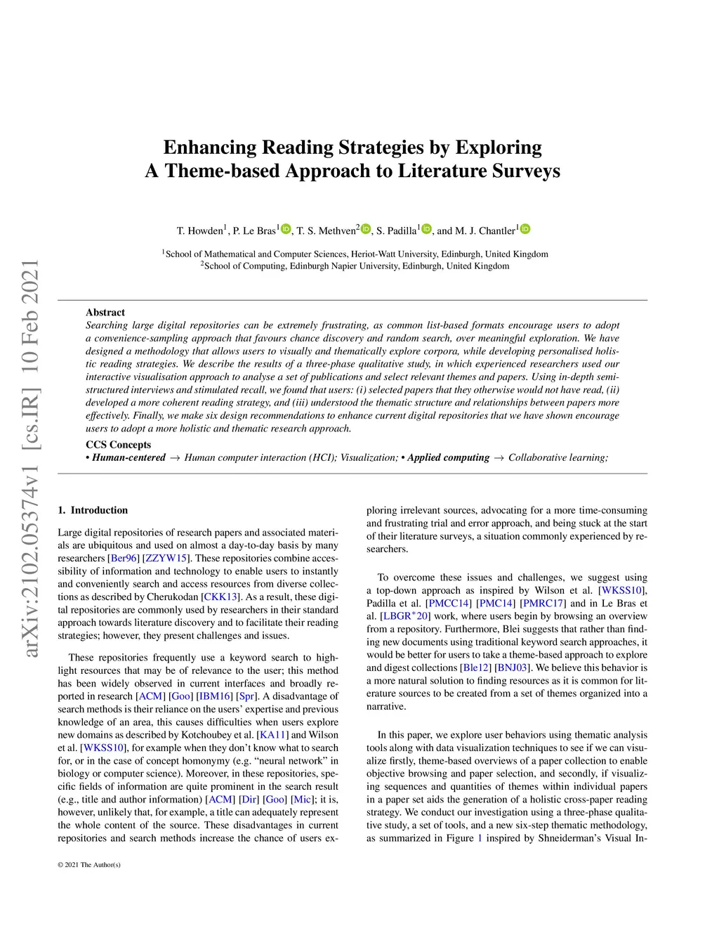 Searching large digital repositories can be extremely frustrating, as common list-based formats encourage users to adopt a convenience-sampling approach that favours chance discovery and random search, over meaningful exploration. We have designed a methodology that allows users to visually and thematically explore corpora, while developing personalised holistic reading strategies. We describe the results of a three-phase qualitative study, in which experienced researchers used our interactive visualisation approach to analyse a set of publications and select relevant themes and papers. Using in-depth semi-structured interviews and stimulated recall, we found that users: (i) selected papers that they otherwise would not have read, (ii) developed a more coherent reading strategy, and (iii) understood the thematic structure and relationships between papers more effectively. Finally, we make six design recommendations to enhance current digital repositories that we have shown encourage users to adopt a more holistic and thematic research approach.