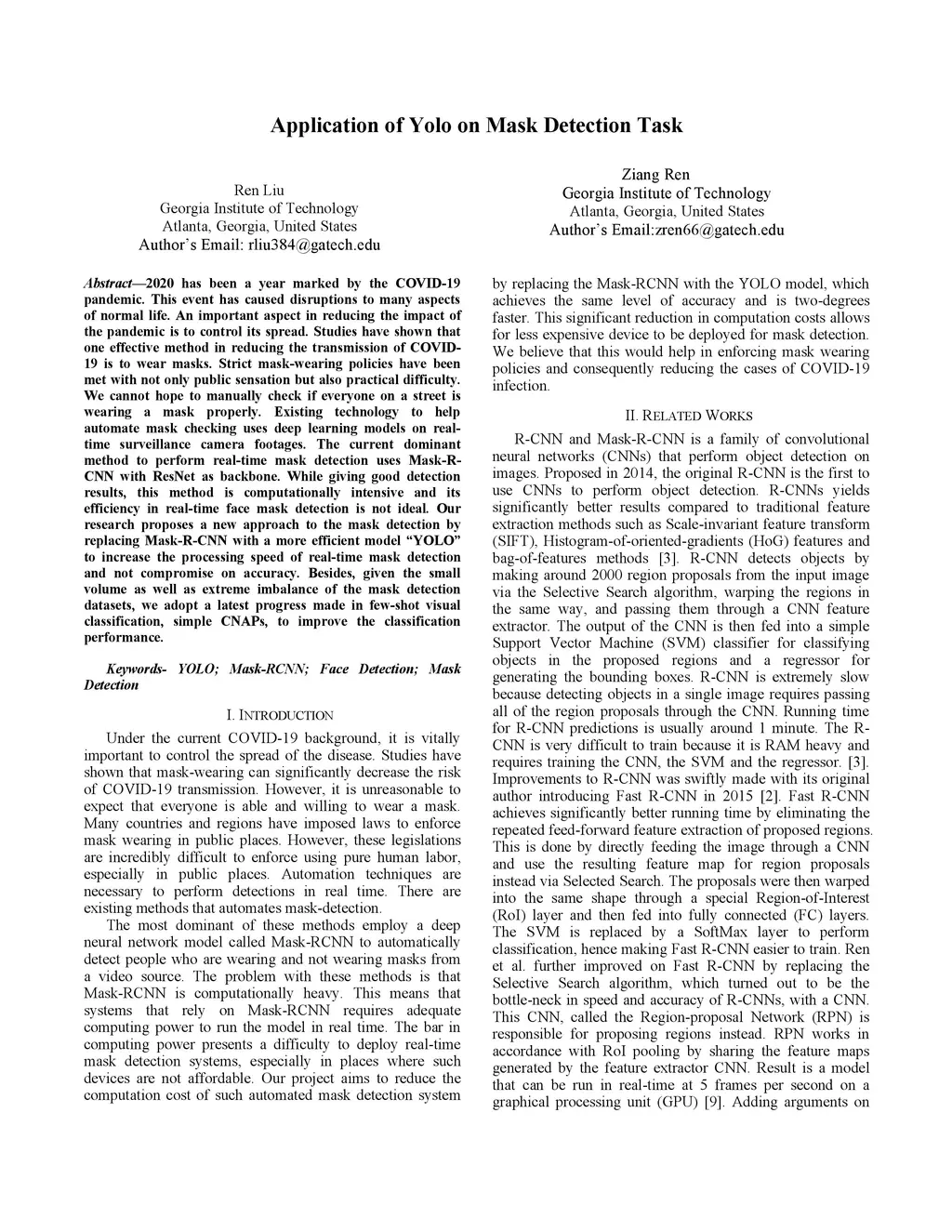 2020 has been a year marked by the COVID-19 pandemic. This event has caused disruptions to many aspects of normal life. An important aspect in reducing the impact of the pandemic is to control its spread. Studies have shown that one effective method in reducing the transmission of COVID-19 is to wear masks. Strict mask-wearing policies have been met with not only public sensation but also practical difficulty. We cannot hope to manually check if everyone on a street is wearing a mask properly. Existing technology to help automate mask checking uses deep learning models on real-time surveillance camera footages. The current dominant method to perform real-time mask detection uses Mask-RCNN with ResNet as the backbone. While giving good detection results, this method is computationally intensive and its efficiency in real-time face mask detection is not ideal. Our research proposes a new approach to mask detection by replacing Mask-R-CNN with a more efficient model "YOLO" to increase the processing speed of real-time mask detection and not compromise on accuracy. Besides, given the small volume as well as extreme imbalance of the mask detection datasets, we adopt a latest progress made in few-shot visual classification, simple CNAPs, to improve the classification performance.