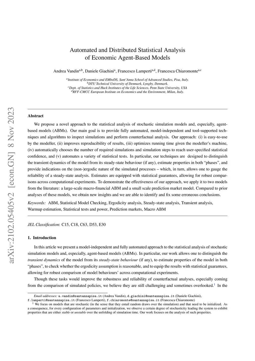 We propose a novel approach to the statistical analysis of stochastic simulation models and, especially, agent-based models (ABMs). Our main goal is to provide fully automated, model-independent and tool-supported techniques and algorithms to inspect simulations and perform counterfactual analysis. Our approach: (i) is easy-to-use by the modeller, (ii) improves reproducibility of results, (iii) optimizes running time given the modeller's machine, (iv) automatically chooses the number of required simulations and simulation steps to reach user-specified statistical confidence, and (v) automates a variety of statistical tests. In particular, our techniques are designed to distinguish the transient dynamics of the model from its steady-state behaviour (if any), estimate properties in both 'phases', and provide indications on the (non-)ergodic nature of the simulated processes - which, in turn, allows one to gauge the reliability of a steady-state analysis. Estimates are equipped with statistical guarantees, allowing for robust comparisons across computational experiments. To demonstrate the effectiveness of our approach, we apply it to two models from the literature: a large-scale macro-financial ABM and a small scale prediction market model. Compared to prior analyses of these models, we obtain new insights and we are able to identify and fix some erroneous conclusions.