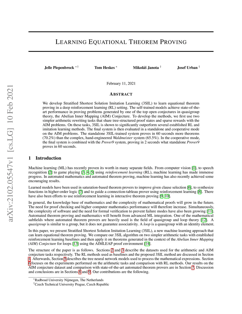 We develop Stratified Shortest Solution Imitation Learning (3SIL) to learn equational theorem proving in a deep reinforcement learning (RL) setting. The self-trained models achieve state-of-the-art performance in proving problems generated by one of the top open conjectures in quasigroup theory, the Abelian Inner Mapping (AIM) Conjecture. To develop the methods, we first use two simpler arithmetic rewriting tasks that share tree-structured proof states and sparse rewards with the AIM problems. On these tasks, 3SIL is shown to significantly outperform several established RL and imitation learning methods. The final system is then evaluated in a standalone and cooperative mode on the AIM problems. The standalone 3SIL-trained system proves in 60 seconds more theorems (70.2%) than the complex, hand-engineered Waldmeister system (65.5%). In the cooperative mode, the final system is combined with the Prover9 system, proving in 2 seconds what standalone Prover9 proves in 60 seconds.