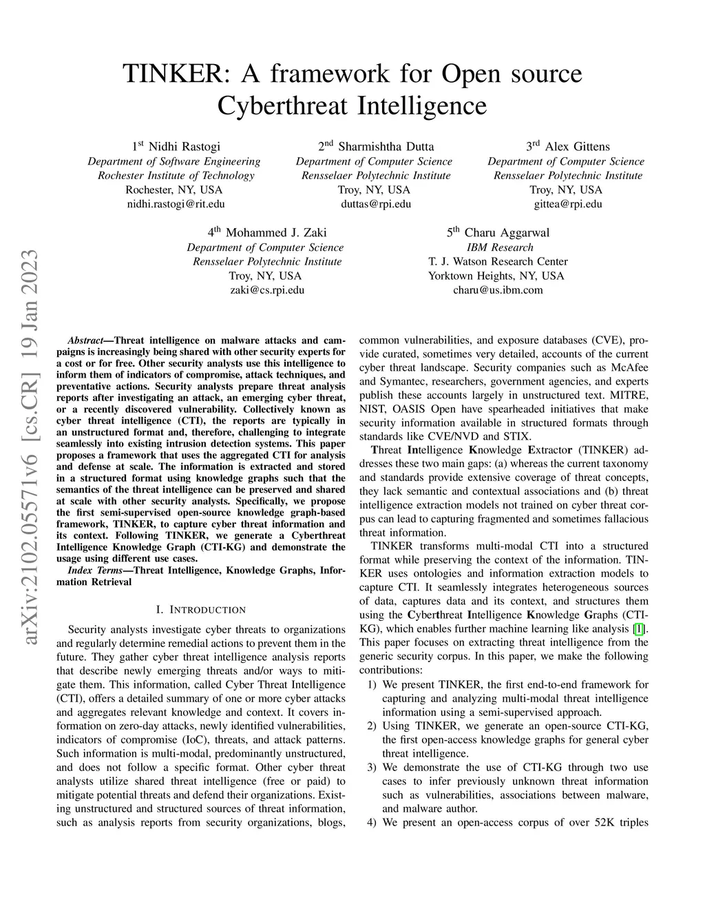 Threat intelligence on malware attacks and campaigns is increasingly being shared with other security experts for a cost or for free. Other security analysts use this intelligence to inform them of indicators of compromise, attack techniques, and preventative actions. Security analysts prepare threat analysis reports after investigating an attack, an emerging cyber threat, or a recently discovered vulnerability. Collectively known as cyber threat intelligence (CTI), the reports are typically in an unstructured format and, therefore, challenging to integrate seamlessly into existing intrusion detection systems. This paper proposes a framework that uses the aggregated CTI for analysis and defense at scale. The information is extracted and stored in a structured format using knowledge graphs such that the semantics of the threat intelligence can be preserved and shared at scale with other security analysts. Specifically, we propose the first semi-supervised open-source knowledge graph-based framework, TINKER, to capture cyber threat information and its context. Following TINKER, we generate a Cyberthreat Intelligence Knowledge Graph (CTI-KG) and demonstrate the usage using different use cases.
