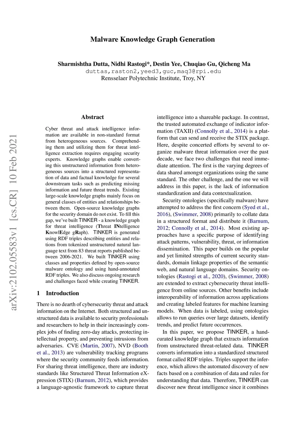 Cyber threat and attack intelligence information are available in non-standard format from heterogeneous sources. Comprehending them and utilizing them for threat intelligence extraction requires engaging security experts. Knowledge graphs enable converting this unstructured information from heterogeneous sources into a structured representation of data and factual knowledge for several downstream tasks such as predicting missing information and future threat trends. Existing large-scale knowledge graphs mainly focus on general classes of entities and relationships between them. Open-source knowledge graphs for the security domain do not exist. To fill this gap, we've built \textsf{TINKER} - a knowledge graph for threat intelligence (\textbf{T}hreat \textbf{IN}telligence \textbf{K}nowl\textbf{E}dge g\textbf{R}aph). \textsf{TINKER} is generated using RDF triples describing entities and relations from tokenized unstructured natural language text from 83 threat reports published between 2006-2021. We built \textsf{TINKER} using classes and properties defined by open-source malware ontology and using hand-annotated RDF triples. We also discuss ongoing research and challenges faced while creating \textsf{TINKER}.