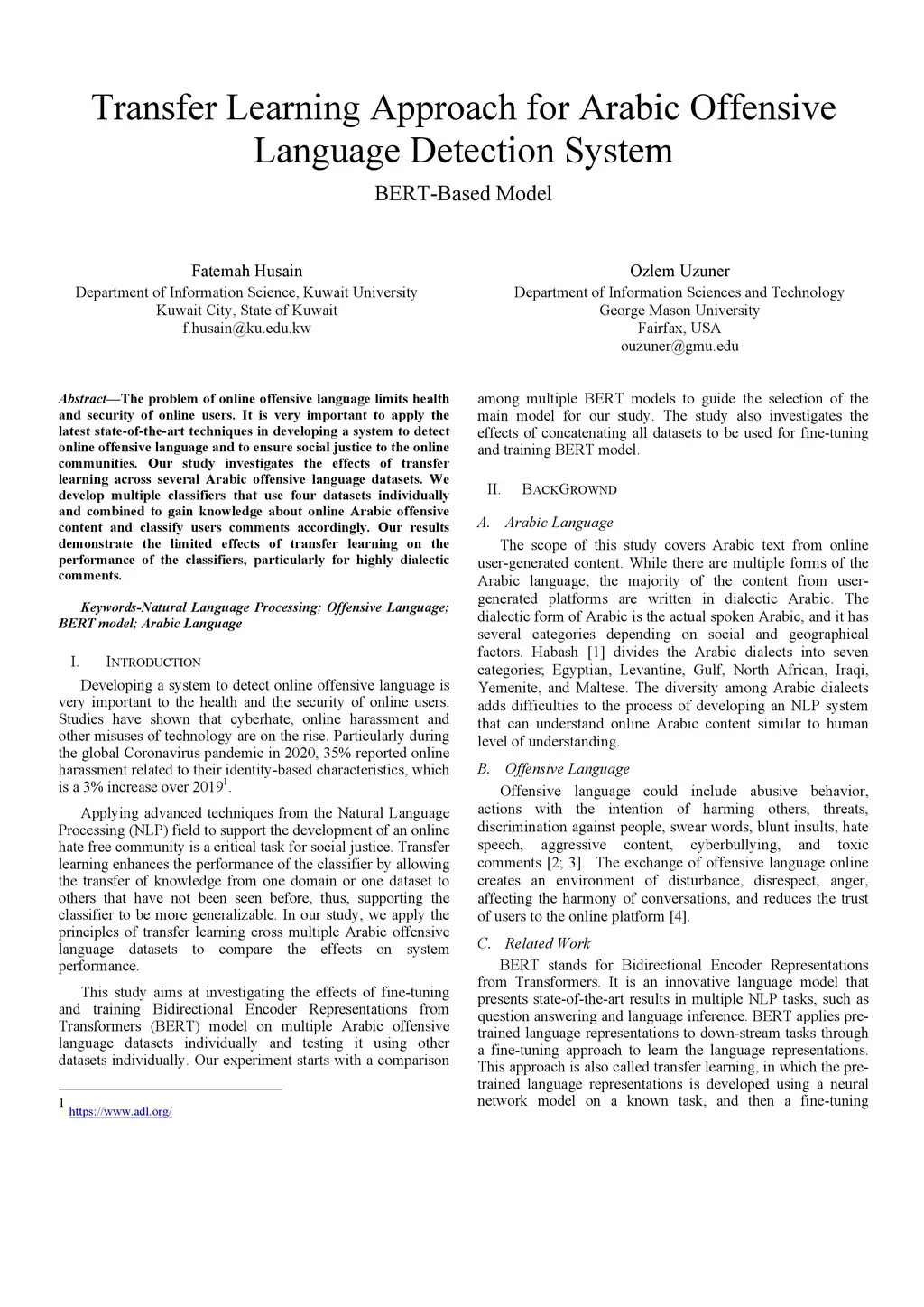 Transfer Learning Approach for Arabic Offensive Language Detection