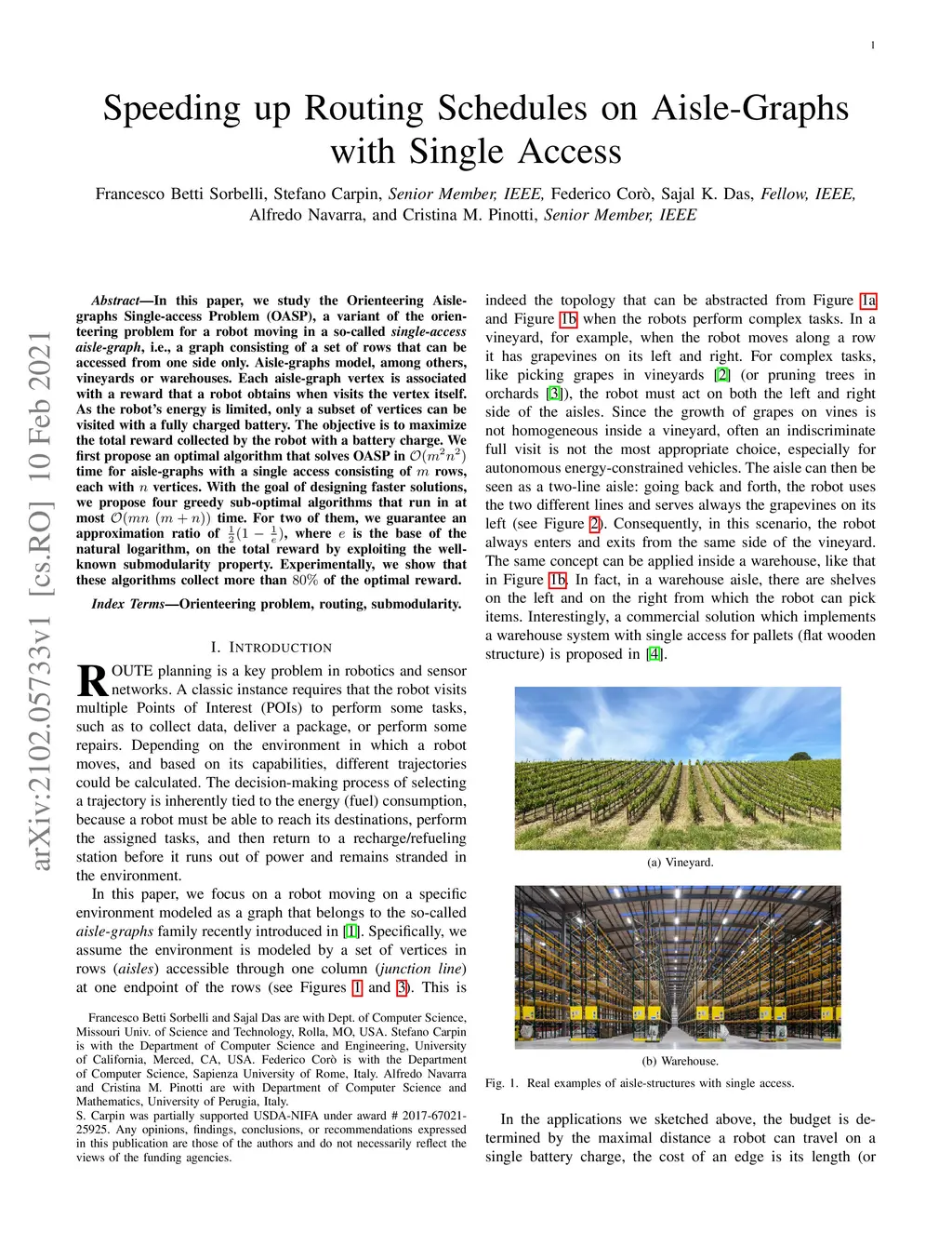 In this paper, we study the Orienteering Aisle-graphs Single-access Problem (OASP), a variant of the orienteering problem for a robot moving in a so-called single-access aisle-graph, i.e., a graph consisting of a set of rows that can be accessed from one side only. Aisle-graphs model, among others, vineyards or warehouses. Each aisle-graph vertex is associated with a reward that a robot obtains when visits the vertex itself. As the robot's energy is limited, only a subset of vertices can be visited with a fully charged battery. The objective is to maximize the total reward collected by the robot with a battery charge. We first propose an optimal algorithm that solves OASP in O(m^2 n^2) time for aisle-graphs with a single access consisting of m rows, each with n vertices. With the goal of designing faster solutions, we propose four greedy sub-optimal algorithms that run in at most O(mn (m+n)) time. For two of them, we guarantee an approximation ratio of 1/2(1-1/e), where e is the base of the natural logarithm, on the total reward by exploiting the well-known submodularity property. Experimentally, we show that these algorithms collect more than 80% of the optimal reward.