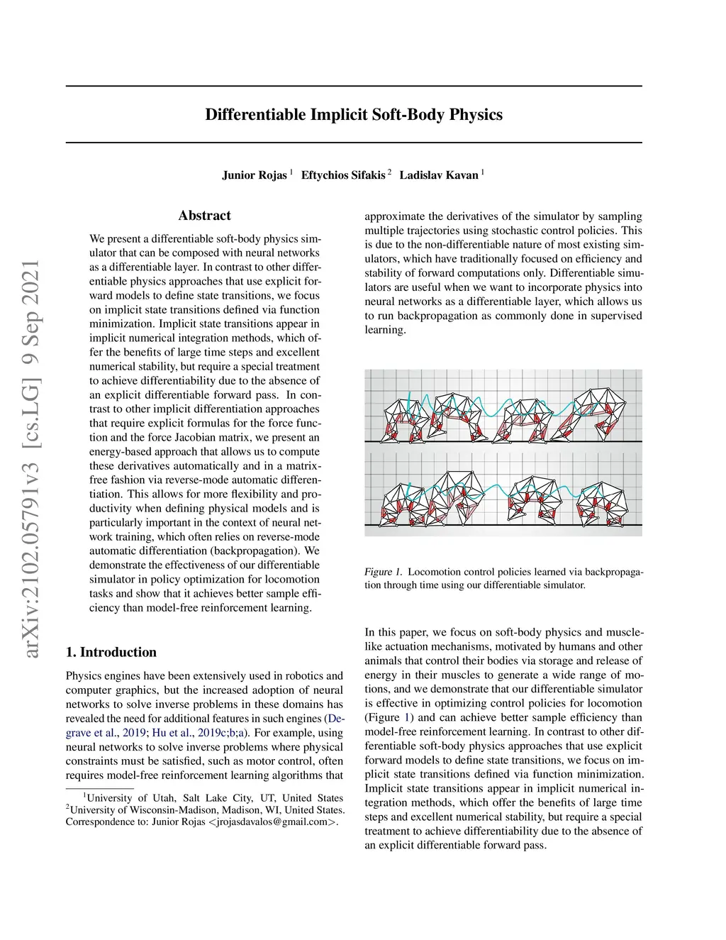 We present a differentiable soft-body physics simulator that can be composed with neural networks as a differentiable layer. In contrast to other differentiable physics approaches that use explicit forward models to define state transitions, we focus on implicit state transitions defined via function minimization. Implicit state transitions appear in implicit numerical integration methods, which offer the benefits of large time steps and excellent numerical stability, but require a special treatment to achieve differentiability due to the absence of an explicit differentiable forward pass. In contrast to other implicit differentiation approaches that require explicit formulas for the force function and the force Jacobian matrix, we present an energy-based approach that allows us to compute these derivatives automatically and in a matrix-free fashion via reverse-mode automatic differentiation. This allows for more flexibility and productivity when defining physical models and is particularly important in the context of neural network training, which often relies on reverse-mode automatic differentiation (backpropagation). We demonstrate the effectiveness of our differentiable simulator in policy optimization for locomotion tasks and show that it achieves better sample efficiency than model-free reinforcement learning.