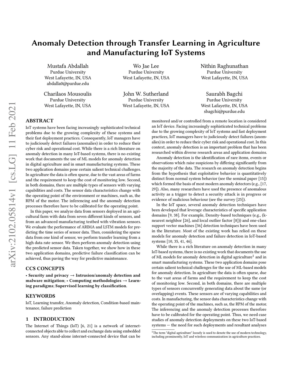 IoT systems have been facing increasingly sophisticated technical problems due to the growing complexity of these systems and their fast deployment practices. Consequently, IoT managers have to judiciously detect failures (anomalies) in order to reduce their cyber risk and operational cost. While there is a rich literature on anomaly detection in many IoT-based systems, there is no existing work that documents the use of ML models for anomaly detection in digital agriculture and in smart manufacturing systems. These two application domains pose certain salient technical challenges. In agriculture the data is often sparse, due to the vast areas of farms and the requirement to keep the cost of monitoring low. Second, in both domains, there are multiple types of sensors with varying capabilities and costs. The sensor data characteristics change with the operating point of the environment or machines, such as, the RPM of the motor. The inferencing and the anomaly detection processes therefore have to be calibrated for the operating point. In this paper, we analyze data from sensors deployed in an agricultural farm with data from seven different kinds of sensors, and from an advanced manufacturing testbed with vibration sensors. We evaluate the performance of ARIMA and LSTM models for predicting the time series of sensor data. Then, considering the sparse data from one kind of sensor, we perform transfer learning from a high data rate sensor. We then perform anomaly detection using the predicted sensor data. Taken together, we show how in these two application domains, predictive failure classification can be achieved, thus paving the way for predictive maintenance.