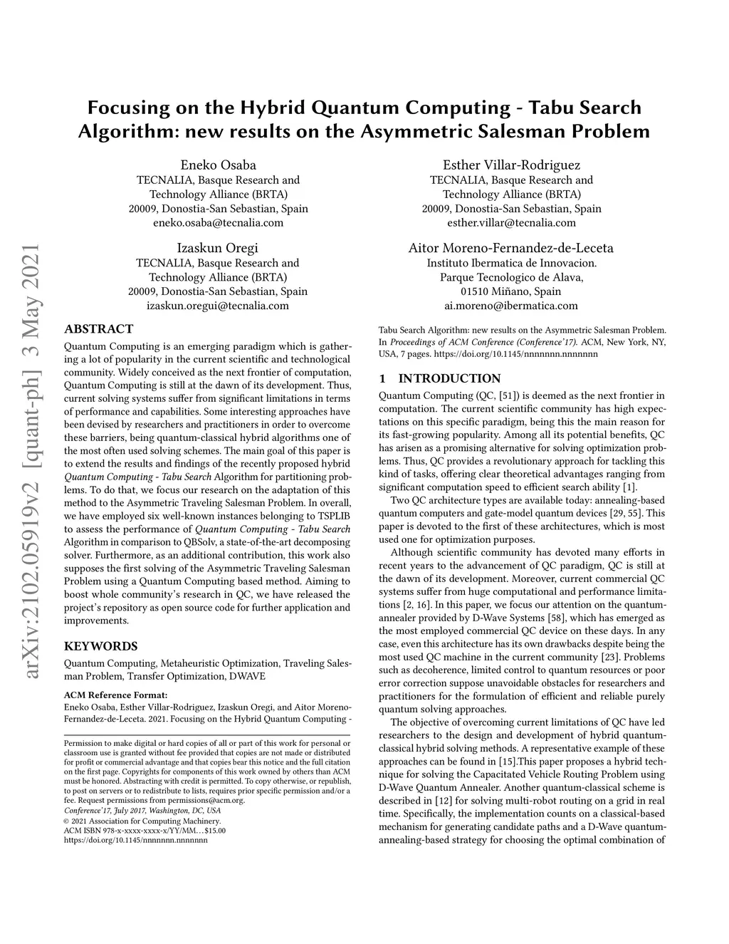 Quantum Computing is an emerging paradigm which is gathering a lot of popularity in the current scientific and technological community. Widely conceived as the next frontier of computation, Quantum Computing is still at the dawn of its development. Thus, current solving systems suffer from significant limitations in terms of performance and capabilities. Some interesting approaches have been devised by researchers and practitioners in order to overcome these barriers, being quantum-classical hybrid algorithms one of the most often used solving schemes. The main goal of this paper is to extend the results and findings of the recently proposed hybrid Quantum Computing - Tabu Search Algorithm for partitioning problems. To do that, we focus our research on the adaptation of this method to the Asymmetric Traveling Salesman Problem. In overall, we have employed six well-known instances belonging to TSPLIB to assess the performance of Quantum Computing - Tabu Search Algorithm in comparison to QBSolv, a state-of-the-art decomposing solver. Furthermore, as an additional contribution, this work also supposes the first solving of the Asymmetric Traveling Salesman Problem using a Quantum Computing based method. Aiming to boost whole community's research in QC, we have released the project's repository as open source code for further application and improvements.