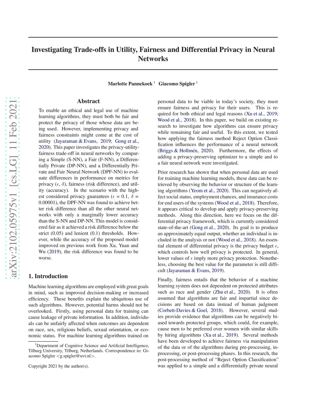 To enable an ethical and legal use of machine learning algorithms, they must both be fair and protect the privacy of those whose data are being used. However, implementing privacy and fairness constraints might come at the cost of utility (Jayaraman & Evans, 2019; Gong et al., 2020). This paper investigates the privacy-utility-fairness trade-off in neural networks by comparing a Simple (S-NN), a Fair (F-NN), a Differentially Private (DP-NN), and a Differentially Private and Fair Neural Network (DPF-NN) to evaluate differences in performance on metrics for privacy (epsilon, delta), fairness (risk difference), and utility (accuracy). In the scenario with the highest considered privacy guarantees (epsilon = 0.1, delta = 0.00001), the DPF-NN was found to achieve better risk difference than all the other neural networks with only a marginally lower accuracy than the S-NN and DP-NN. This model is considered fair as it achieved a risk difference below the strict (0.05) and lenient (0.1) thresholds. However, while the accuracy of the proposed model improved on previous work from Xu, Yuan and Wu (2019), the risk difference was found to be worse.