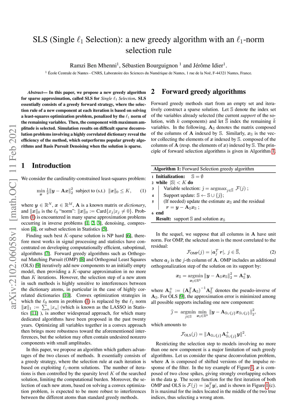 In this paper, we propose a new greedy algorithm for sparse approximation, called SLS for Single L_1 Selection. SLS essentially consists of a greedy forward strategy, where the selection rule of a new component at each iteration is based on solving a least-squares optimization problem, penalized by the L_1 norm of the remaining variables. Then, the component with maximum amplitude is selected. Simulation results on difficult sparse deconvolution problems involving a highly correlated dictionary reveal the efficiency of the method, which outperforms popular greedy algorithms and Basis Pursuit Denoising when the solution is sparse.