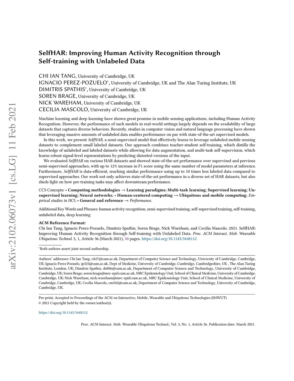 SelfHAR: Improving Human Activity Recognition through Self-training with