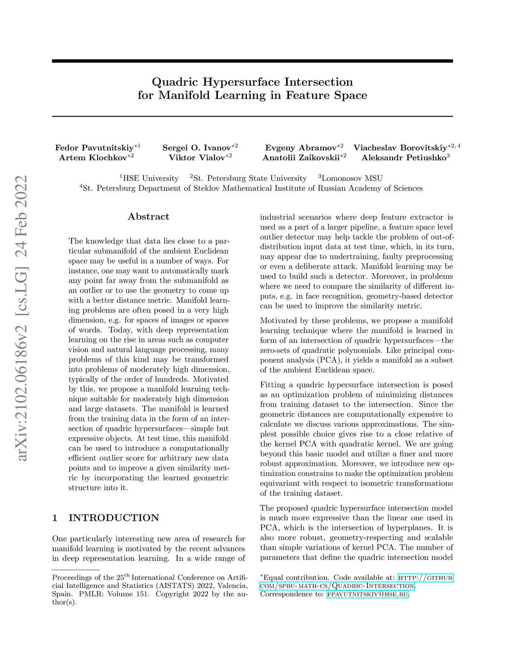 Quadric Hypersurface Intersection for Manifold Learning in Feature Space