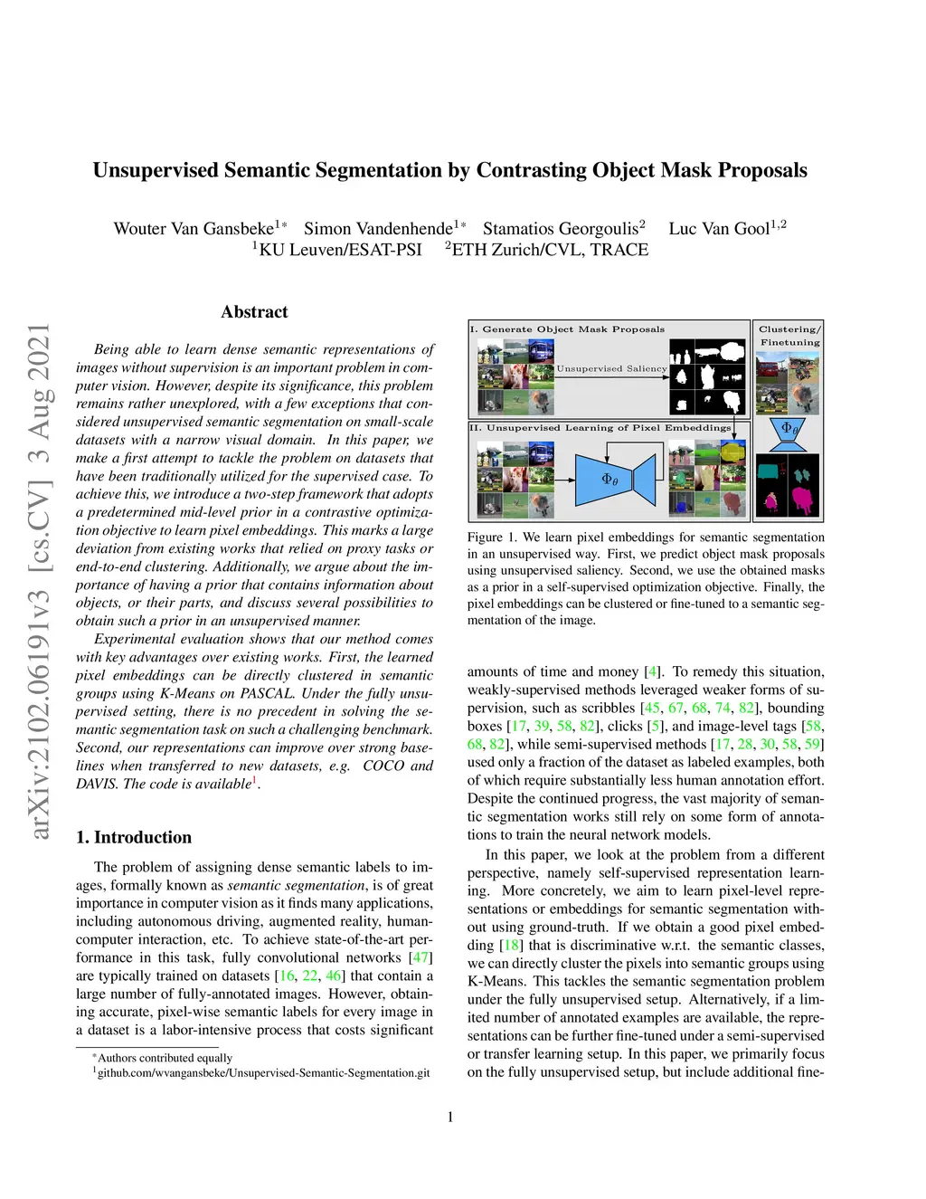 Being able to learn dense semantic representations of images without supervision is an important problem in computer vision. However, despite its significance, this problem remains rather unexplored, with a few exceptions that considered unsupervised semantic segmentation on small-scale datasets with a narrow visual domain. In this paper, we make a first attempt to tackle the problem on datasets that have been traditionally utilized for the supervised case. To achieve this, we introduce a two-step framework that adopts a predetermined mid-level prior in a contrastive optimization objective to learn pixel embeddings. This marks a large deviation from existing works that relied on proxy tasks or end-to-end clustering. Additionally, we argue about the importance of having a prior that contains information about objects, or their parts, and discuss several possibilities to obtain such a prior in an unsupervised manner. Experimental evaluation shows that our method comes with key advantages over existing works. First, the learned pixel embeddings can be directly clustered in semantic groups using K-Means on PASCAL. Under the fully unsupervised setting, there is no precedent in solving the semantic segmentation task on such a challenging benchmark. Second, our representations can improve over strong baselines when transferred to new datasets, e.g. COCO and DAVIS. The code is available.