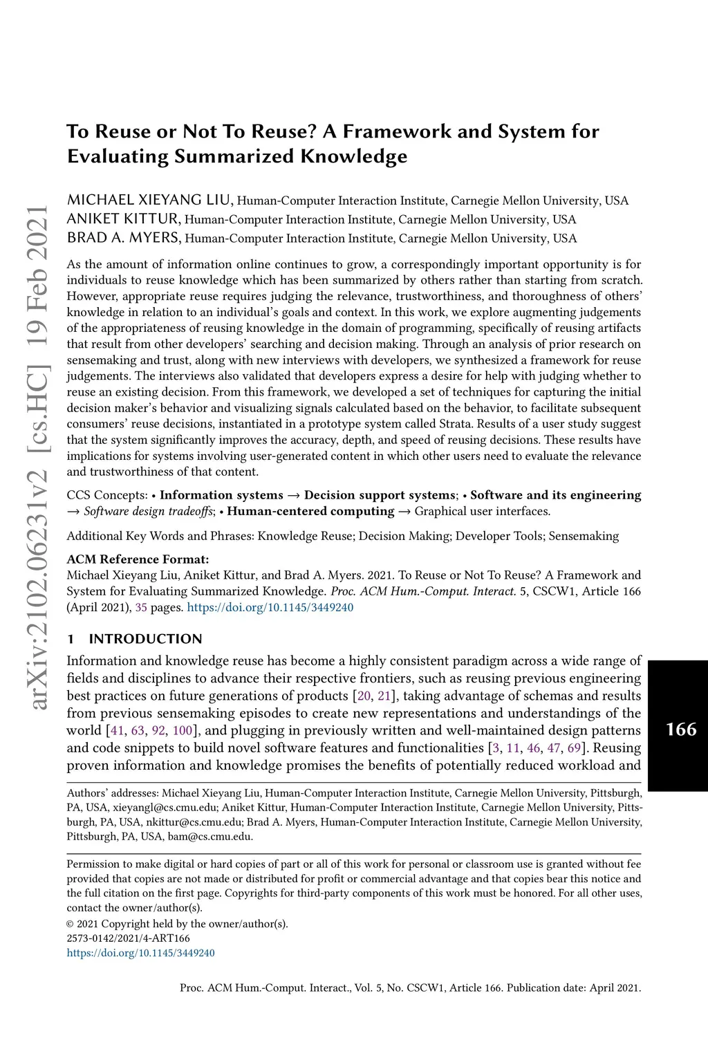 As the amount of information online continues to grow, a correspondingly important opportunity is for individuals to reuse knowledge which has been summarized by others rather than starting from scratch. However, appropriate reuse requires judging the relevance, trustworthiness, and thoroughness of others' knowledge in relation to an individual's goals and context. In this work, we explore augmenting judgements of the appropriateness of reusing knowledge in the domain of programming, specifically of reusing artifacts that result from other developers' searching and decision making. Through an analysis of prior research on sensemaking and trust, along with new interviews with developers, we synthesized a framework for reuse judgements. The interviews also validated that developers express a desire for help with judging whether to reuse an existing decision. From this framework, we developed a set of techniques for capturing the initial decision maker's behavior and visualizing signals calculated based on the behavior, to facilitate subsequent consumers' reuse decisions, instantiated in a prototype system called Strata. Results of a user study suggest that the system significantly improves the accuracy, depth, and speed of reusing decisions. These results have implications for systems involving user-generated content in which other users need to evaluate the relevance and trustworthiness of that content.
