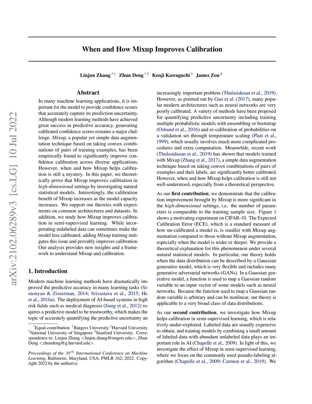 In many machine learning applications, it is important for the model to provide confidence scores that accurately capture its prediction uncertainty. Although modern learning methods have achieved great success in predictive accuracy, generating calibrated confidence scores remains a major challenge. Mixup, a popular yet simple data augmentation technique based on taking convex combinations of pairs of training examples, has been empirically found to significantly improve confidence calibration across diverse applications. However, when and how Mixup helps calibration is still a mystery. In this paper, we theoretically prove that Mixup improves calibration in \textit{high-dimensional} settings by investigating natural statistical models. Interestingly, the calibration benefit of Mixup increases as the model capacity increases. We support our theories with experiments on common architectures and datasets. In addition, we study how Mixup improves calibration in semi-supervised learning. While incorporating unlabeled data can sometimes make the model less calibrated, adding Mixup training mitigates this issue and provably improves calibration. Our analysis provides new insights and a framework to understand Mixup and calibration.