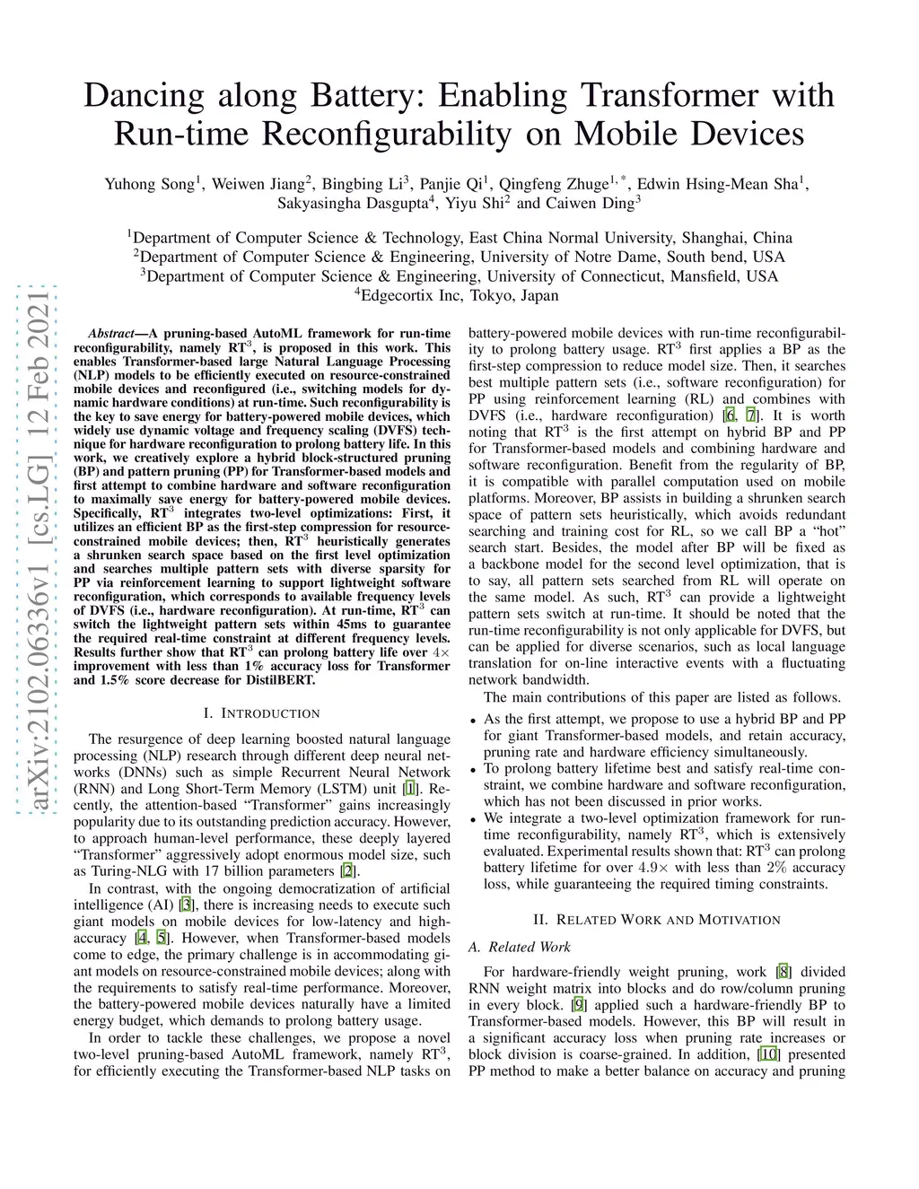 A pruning-based AutoML framework for run-time reconfigurability, namely RT3, is proposed in this work. This enables Transformer-based large Natural Language Processing (NLP) models to be efficiently executed on resource-constrained mobile devices and reconfigured (i.e., switching models for dynamic hardware conditions) at run-time. Such reconfigurability is the key to save energy for battery-powered mobile devices, which widely use dynamic voltage and frequency scaling (DVFS) technique for hardware reconfiguration to prolong battery life. In this work, we creatively explore a hybrid block-structured pruning (BP) and pattern pruning (PP) for Transformer-based models and first attempt to combine hardware and software reconfiguration to maximally save energy for battery-powered mobile devices. Specifically, RT3 integrates two-level optimizations: First, it utilizes an efficient BP as the first-step compression for resource-constrained mobile devices; then, RT3 heuristically generates a shrunken search space based on the first level optimization and searches multiple pattern sets with diverse sparsity for PP via reinforcement learning to support lightweight software reconfiguration, which corresponds to available frequency levels of DVFS (i.e., hardware reconfiguration). At run-time, RT3 can switch the lightweight pattern sets within 45ms to guarantee the required real-time constraint at different frequency levels. Results further show that RT3 can prolong battery life over 4x improvement with less than 1% accuracy loss for Transformer and 1.5% score decrease for DistilBERT.