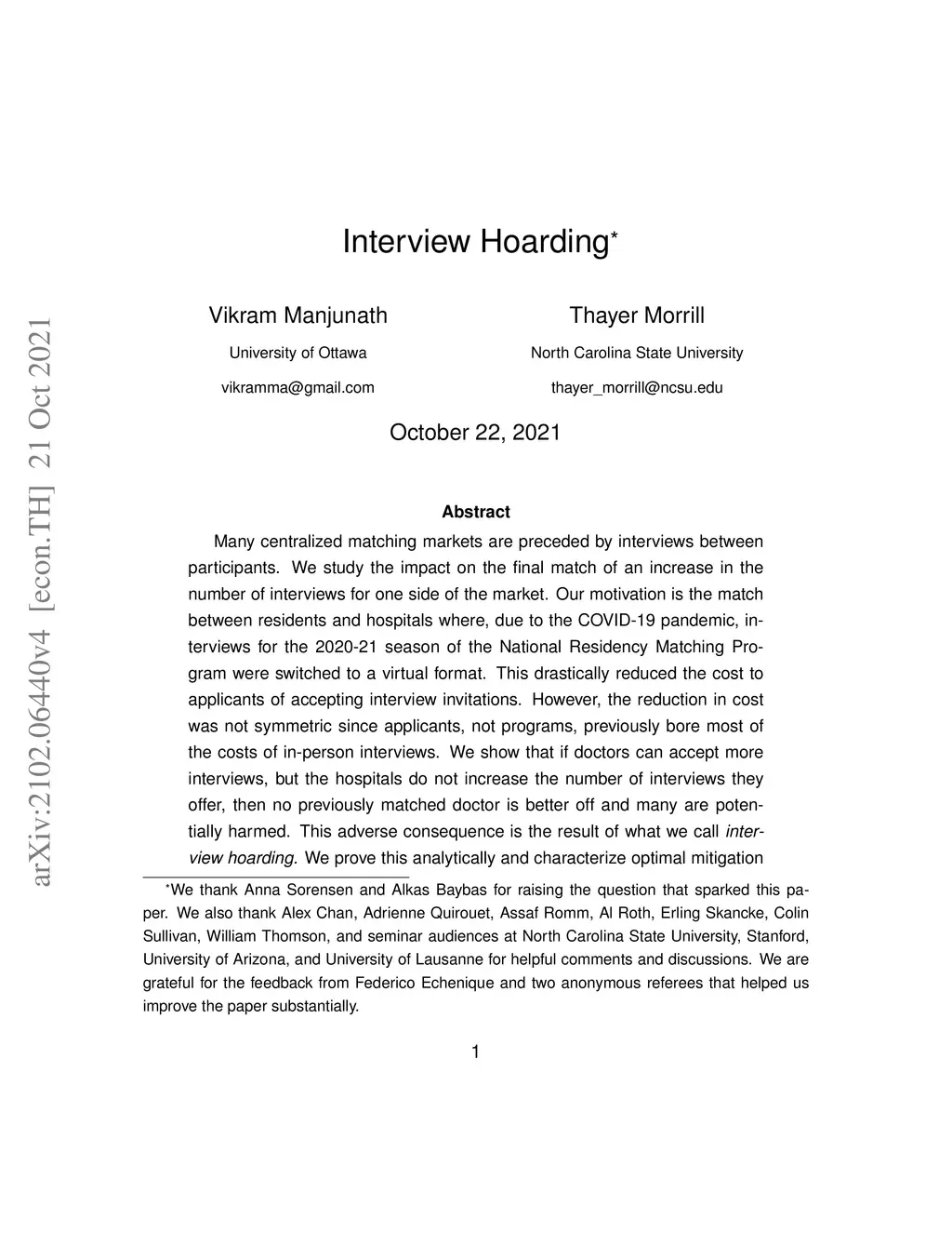 Many centralized matching markets are preceded by interviews between participants. We study the impact on the final match of an increase in the number of interviews for one side of the market. Our motivation is the match between residents and hospitals where, due to the COVID-19 pandemic, interviews for the 2020-21 season of the National Residency Matching Program were switched to a virtual format. This drastically reduced the cost to applicants of accepting interview invitations. However, the reduction in cost was not symmetric since applicants, not programs, previously bore most of the costs of in-person interviews. We show that if doctors can accept more interviews, but the hospitals do not increase the number of interviews they offer, then no previously matched doctor is better off and many are potentially harmed. This adverse consequence is the result of what we call interview hoarding. We prove this analytically and characterize optimal mitigation strategies for special cases. We use simulations to extend these insights to more general settings.