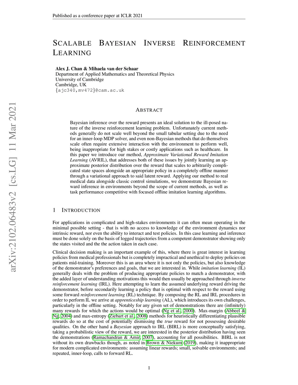 Bayesian inference over the reward presents an ideal solution to the ill-posed nature of the inverse reinforcement learning problem. Unfortunately current methods generally do not scale well beyond the small tabular setting due to the need for an inner-loop MDP solver, and even non-Bayesian methods that do themselves scale often require extensive interaction with the environment to perform well, being inappropriate for high stakes or costly applications such as healthcare. In this paper we introduce our method, Approximate Variational Reward Imitation Learning (AVRIL), that addresses both of these issues by jointly learning an approximate posterior distribution over the reward that scales to arbitrarily complicated state spaces alongside an appropriate policy in a completely offline manner through a variational approach to said latent reward. Applying our method to real medical data alongside classic control simulations, we demonstrate Bayesian reward inference in environments beyond the scope of current methods, as well as task performance competitive with focused offline imitation learning algorithms.